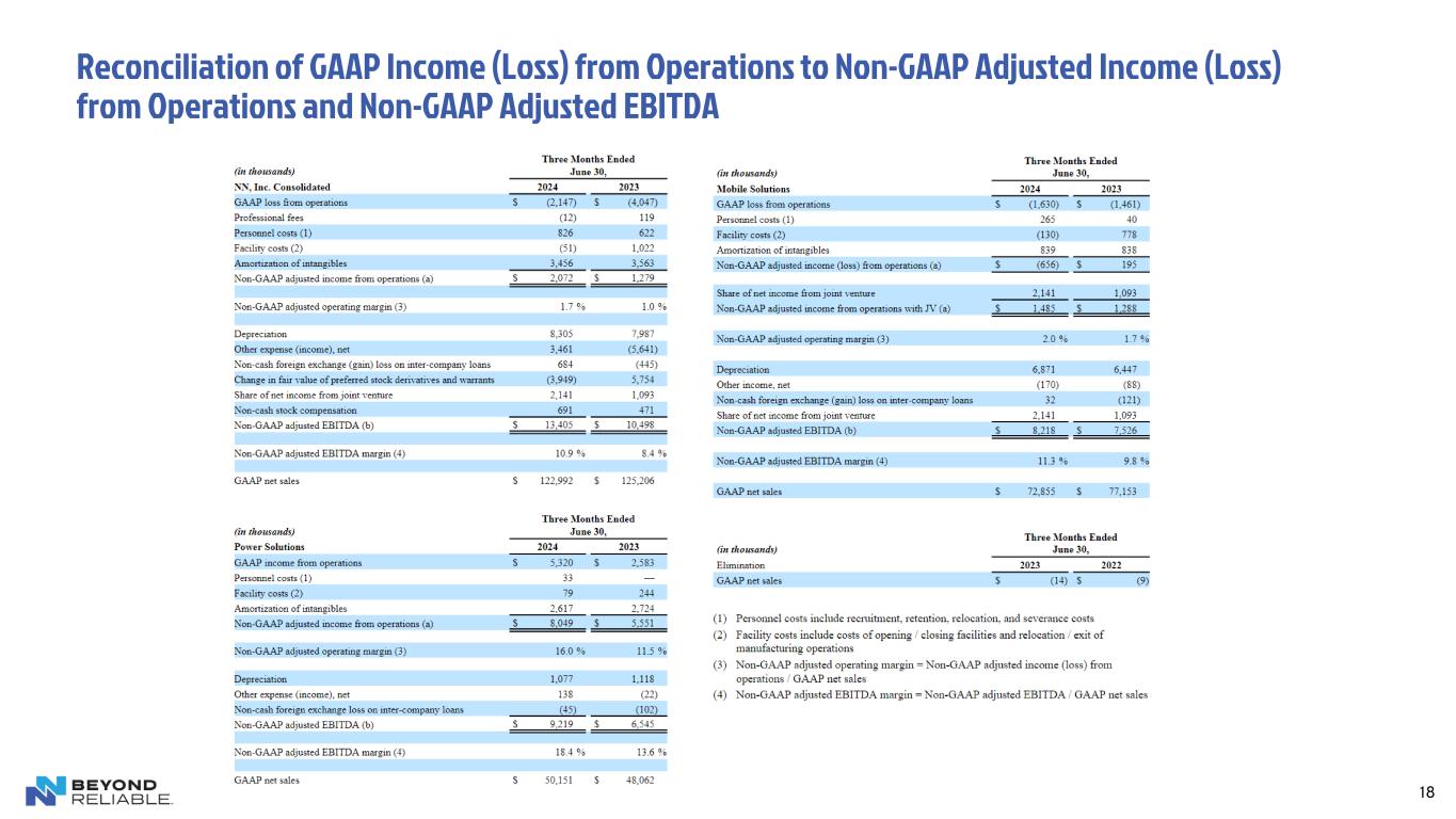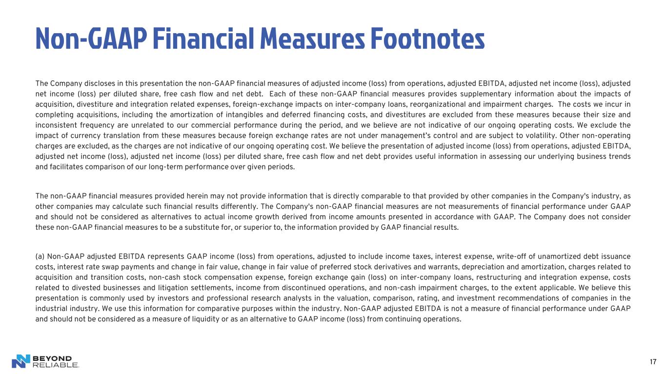 17 The Company discloses in this presentation the non-GAAP financial measures of adjusted income (loss) from operations, adjusted EBITDA, adjusted net income (loss), adjusted net income (loss) per diluted share, free cash flow and net debt. Each of these non-GAAP financial measures provides supplementary information about the impacts of acquisition, divestiture and integration related expenses, foreign-exchange impacts on inter-company loans, reorganizational and impairment charges. The costs we incur in completing acquisitions, including the amortization of intangibles and deferred financing costs, and divestitures are excluded from these measures because their size and inconsistent frequency are unrelated to our commercial performance during the period, and we believe are not indicative of our ongoing operating costs. We exclude the impact of currency translation from these measures because foreign exchange rates are not under management’s control and are subject to volatility. Other non-operating charges are excluded, as the charges are not indicative of our ongoing operating cost. We believe the presentation of adjusted income (loss) from operations, adjusted EBITDA, adjusted net income (loss), adjusted net income (loss) per diluted share, free cash flow and net debt provides useful information in assessing our underlying business trends and facilitates comparison of our long-term performance over given periods. The non-GAAP financial measures provided herein may not provide information that is directly comparable to that provided by other companies in the Company's industry, as other companies may calculate such financial results differently. The Company's non-GAAP financial measures are not measurements of financial performance under GAAP and should not be considered as alternatives to actual income growth derived from income amounts presented in accordance with GAAP. The Company does not consider these non-GAAP financial measures to be a substitute for, or superior to, the information provided by GAAP financial results. (a) Non-GAAP adjusted EBITDA represents GAAP income (loss) from operations, adjusted to include income taxes, interest expense, write-off of unamortized debt issuance costs, interest rate swap payments and change in fair value, change in fair value of preferred stock derivatives and warrants, depreciation and amortization, charges related to acquisition and transition costs, non-cash stock compensation expense, foreign exchange gain (loss) on inter-company loans, restructuring and integration expense, costs related to divested businesses and litigation settlements, income from discontinued operations, and non-cash impairment charges, to the extent applicable. We believe this presentation is commonly used by investors and professional research analysts in the valuation, comparison, rating, and investment recommendations of companies in the industrial industry. We use this information for comparative purposes within the industry. Non-GAAP adjusted EBITDA is not a measure of financial performance under GAAP and should not be considered as a measure of liquidity or as an alternative to GAAP income (loss) from continuing operations. Non-GAAP Financial Measures Footnotes