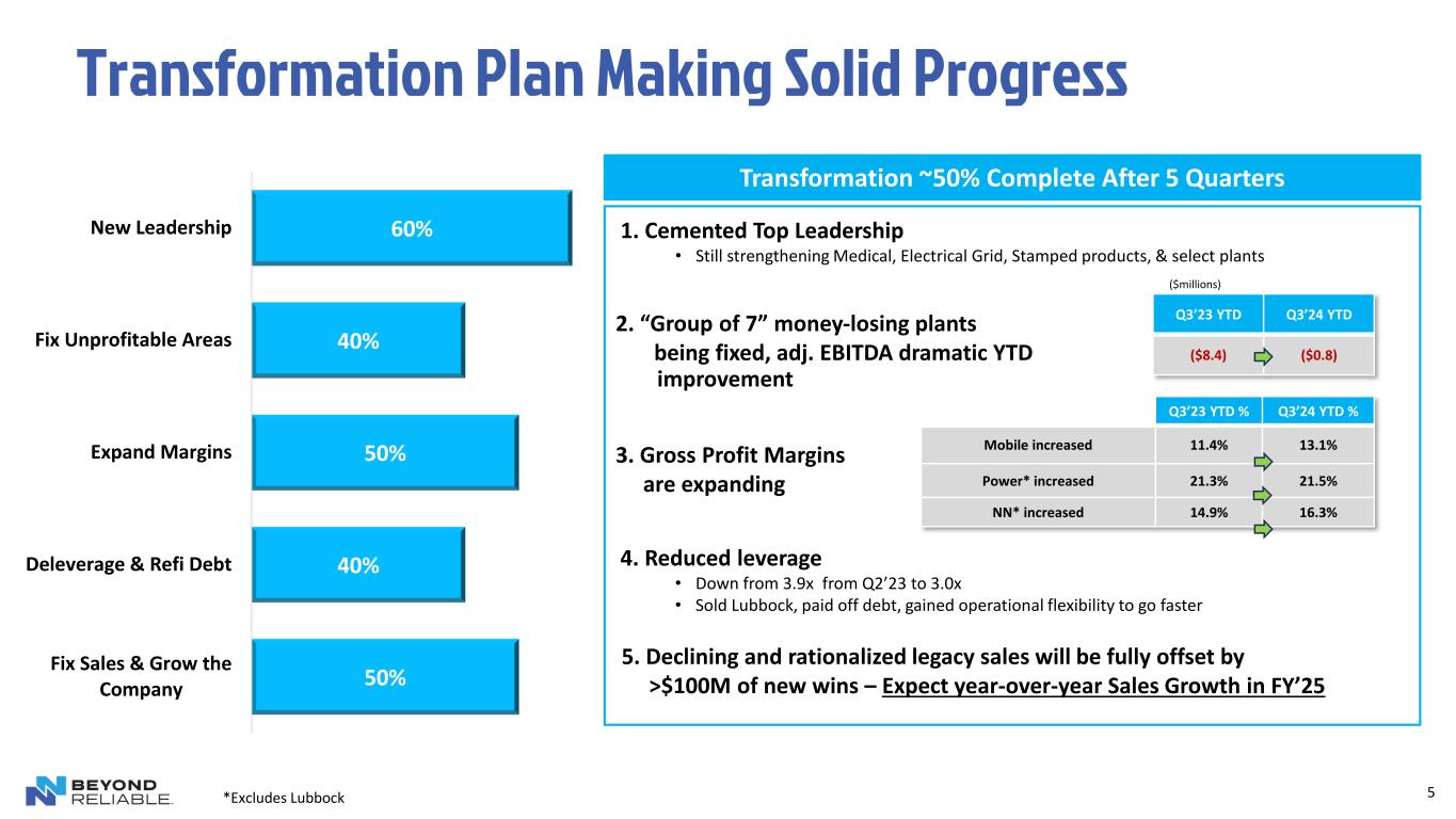 5 50% 40% 50% 40% 60% Fix Sales & Grow the Company Deleverage & Refi Debt Expand Margins Fix Unprofitable Areas New Leadership Q3’23 YTD Q3’24 YTD ($8.4) ($0.8) Q3’23 YTD % Q3’24 YTD % Mobile increased 11.4% 13.1% Power* increased 21.3% 21.5% NN* increased 14.9% 16.3% Transformation Plan Making Solid Progress 1. Cemented Top Leadership • Still strengthening Medical, Electrical Grid, Stamped products, & select plants 2. “Group of 7” money-losing plants being fixed, adj. EBITDA dramatic YTD 3. Gross Profit Margins are expanding 4. Reduced leverage • Down from 3.9x from Q2’23 to 3.0x • Sold Lubbock, paid off debt, gained operational flexibility to go faster 5. Declining and rationalized legacy sales will be fully offset by >$100M of new wins – Expect year-over-year Sales Growth in FY’25 Transformation ~50% Complete After 5 Quarters ($millions) *Excludes Lubbock improvement