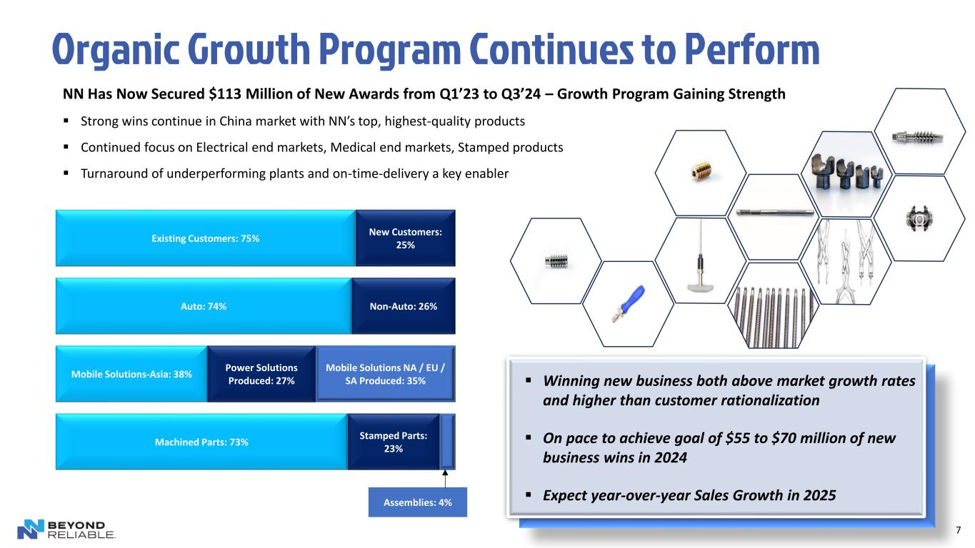 6 NN’s Markets Healthy, Business On Track Primary End Market Outlook End Market ~% of NN Revenue Market Indicators +/– NN’s Outlook vs. Market Global Passenger Vehicle 40% Global light vehicle market sales in recovery; global demand remains mixed China market significantly outpacing US/EU in BEV, Y/Y, and share of EVs is increasing rapidly as China EV leaders are dominating other global brands US light vehicle forecast up modestly (LSD%) in FY25; Globally inventory and demand are balanced Expanding capacity in China to make highest value products; steering, braking, and fuel efficiency The ‘Connect and Protect’ product line is focused onto electrical connector, electrical harness and bus bar for vehicles and chargers General Industrial, Other 30% Statista forecasts approximately 3% growth Demand is generally steady for the industries that we serve Power Grid and Electricity Control 15% Global power grid market modest growth, driven by software and replacement Electrical distribution and control strong in Industrial, weaker in construction Strong smart meter business is healthy and growing; residential construction is flat-ish for circuit breaker products, business is steady Commercial Vehicle 10% Line haul to be down in FY’25, up significantly in FY’26 Market volatility in Class 6-8 higher than in passenger vehicles China now 1/3rd of global commercial trucks built NN’s business is not expected to see much impact from market events Applications where NN operates are stronger than headline market demand Medical Equipment, Surgical Tools, and Implants 5% Orthopedic sales expected to increase approximately 3-4% year-over-year through 2026 Focused on growing a robust pipeline of new programs and awards Expanded long-term goal to $100M net sales