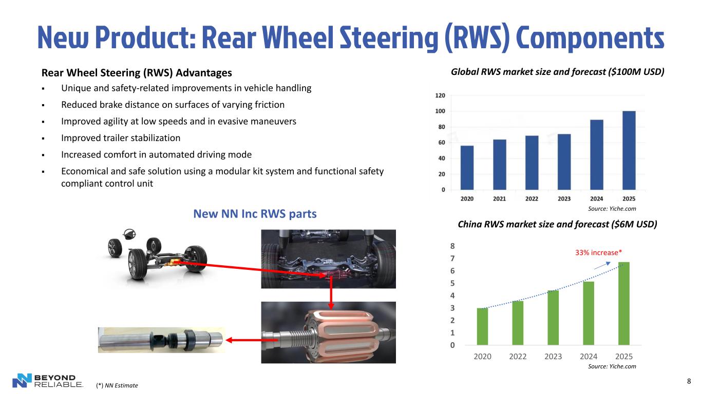 8 New Product: Rear Wheel Steering (RWS) Components Global RWS market size and forecast ($100M USD) 0 1 2 3 4 5 6 7 8 2020 2022 2023 2024 2025 33% increase* China RWS market size and forecast ($6M USD) New NN Inc RWS parts Rear Wheel Steering (RWS) Advantages ▪ Unique and safety-related improvements in vehicle handling ▪ Reduced brake distance on surfaces of varying friction ▪ Improved agility at low speeds and in evasive maneuvers ▪ Improved trailer stabilization ▪ Increased comfort in automated driving mode ▪ Economical and safe solution using a modular kit system and functional safety compliant control unit (*) NN Estimate Source: Yiche.com Source: Yiche.com