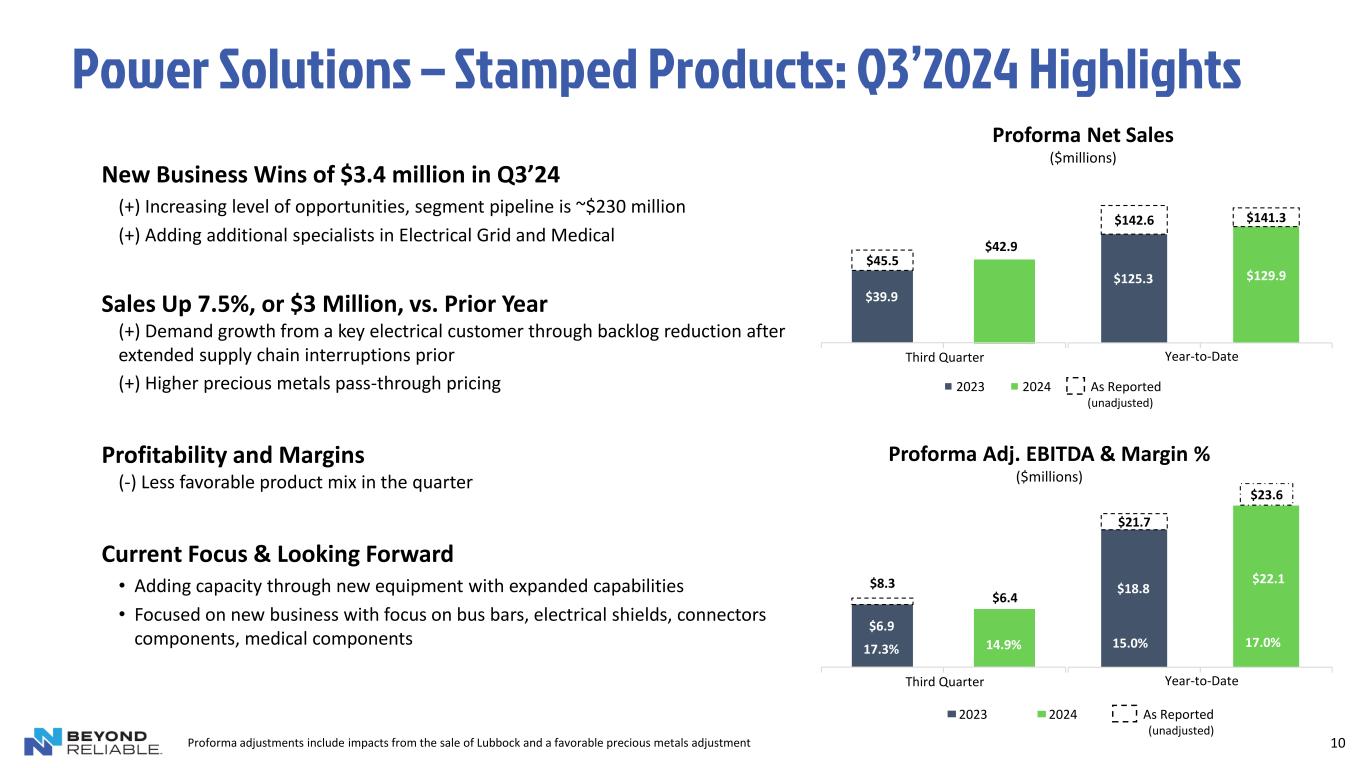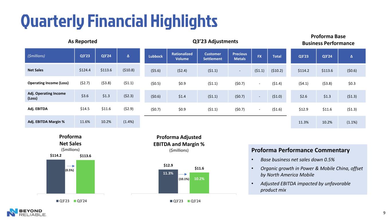 $114.2 $113.6 Proforma Net Sales ($millions) Q3'23 Q3'24 1 1 .6 % ($millions) Q3’23 Q3’24 Δ Net Sales $124.4 $113.6 ($10.8) Operating Income (Loss) ($2.7) ($3.8) ($1.1) Adj. Operating Income (Loss) $3.6 $1.3 ($2.3) Adj. EBITDA $14.5 $11.6 ($2.9) Adj. EBITDA Margin % 11.6% 10.2% (1.4%) Q3’23 Q3’24 Δ $114.2 $113.6 ($0.6) ($4.1) ($3.8) $0.3 $2.6 $1.3 ($1.3) $12.9 $11.6 ($1.3) 11.3% 10.2% (1.1%) Lubbock Rationalized Volume Customer Settlement Precious Metals FX Total ($5.6) ($2.4) ($1.1) - ($1.1) ($10.2) ($0.5) $0.9 ($1.1) ($0.7) - ($1.4) ($0.6) $1.4 ($1.1) ($0.7) - ($1.0) ($0.7) $0.9 ($1.1) ($0.7) - ($1.6) (0.5%) $12.9 $11.6 Proforma Adjusted EBITDA and Margin % ($millions) Q3'23 Q3'24 11.3% 10.2% Proforma Performance Commentary • Base business net sales down 0.5% • Organic growth in Power & Mobile China, offset by North America Mobile • Adjusted EBITDA impacted by unfavorable product mix Proforma Base Business PerformanceAs Reported Q3’23 Adjustments (10.1%) Quarterly Financial Highlights 9