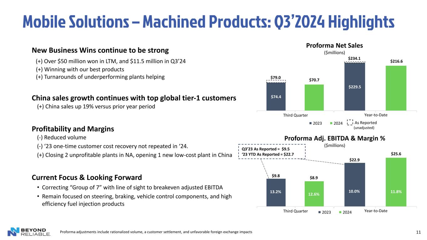 Power Solutions – Stamped Products: Q3’2024 Highlights 10 $39.9 $45.5 $42.9 2023 2024Third Quarter $125.3 $129.9 $142.6 $141.3 2023 2024 Year-to-Date Proforma Net Sales ($millions) 2023 2024 As Reported (unadjusted) $6.9 $8.3 $6.4 2023 2024Third Quarter $18.8 $21.7 $23.6 2023 2024 Year-to-Date $22.1 Proforma Adj. EBITDA & Margin % ($millions) 2023 2024 As Reported (unadjusted) 17.3% 14.9% 15.0% 17.0% New Business Wins of $3.4 million in Q3’24 (+) Increasing level of opportunities, segment pipeline is ~$230 million (+) Adding additional specialists in Electrical Grid and Medical Sales Up 7.5%, or $3 Million, vs. Prior Year (+) Demand growth from a key electrical customer through backlog reduction after extended supply chain interruptions prior (+) Higher precious metals pass-through pricing Profitability and Margins (-) Less favorable product mix in the quarter Current Focus & Looking Forward • Adding capacity through new equipment with expanded capabilities • Focused on new business with focus on bus bars, electrical shields, connectors components, medical components Proforma adjustments include impacts from the sale of Lubbock and a favorable precious metals adjustment