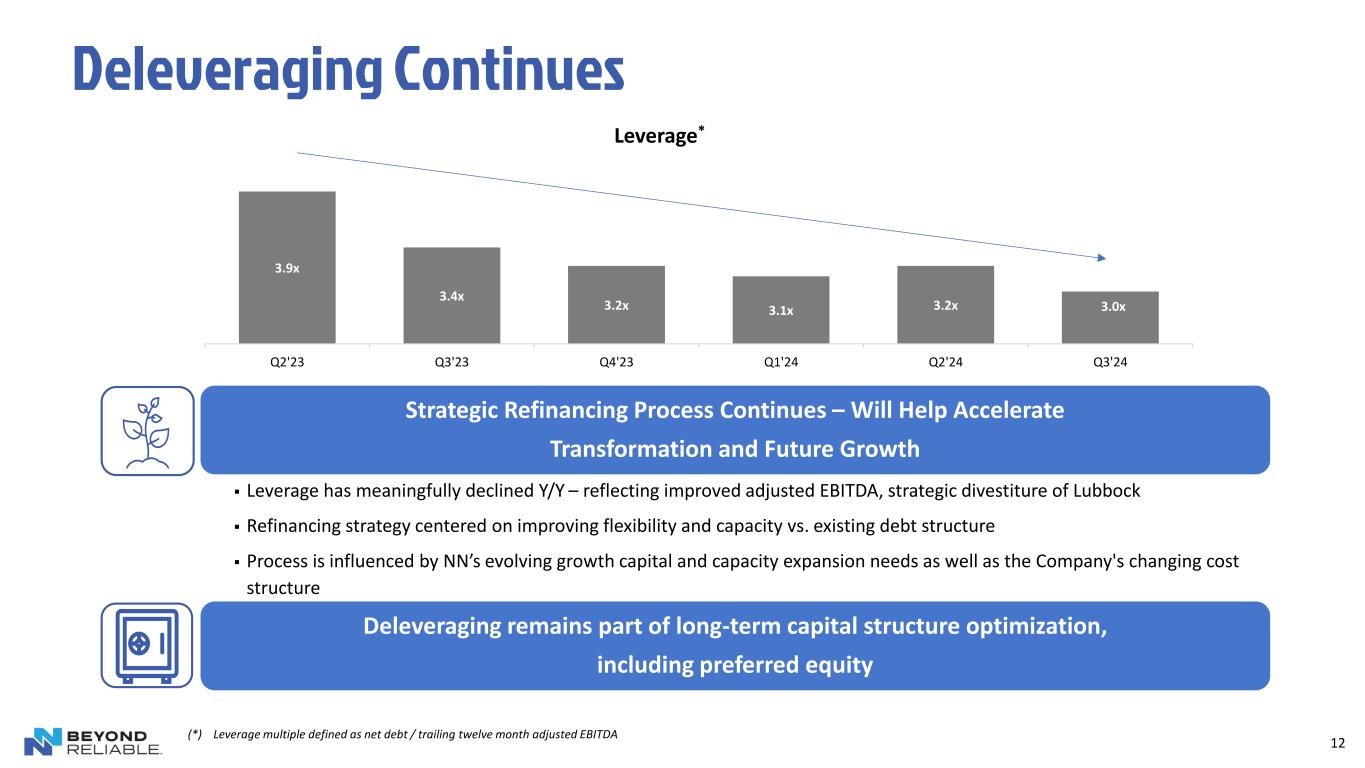 3.9x 3.4x 3.2x 3.1x 3.2x 3.0x Q2'23 Q3'23 Q4'23 Q1'24 Q2'24 Q3'24 Leverage* 12 Deleveraging Continues (*) Leverage multiple defined as net debt / trailing twelve month adjusted EBITDA Strategic Refinancing Process Continues – Will Help Accelerate Transformation and Future Growth ▪ Leverage has meaningfully declined Y/Y – reflecting improved adjusted EBITDA, strategic divestiture of Lubbock ▪ Refinancing strategy centered on improving flexibility and capacity vs. existing debt structure ▪ Process is influenced by NN’s evolving growth capital and capacity expansion needs as well as the Company's changing cost structure Deleveraging remains part of long-term capital structure optimization, including preferred equity