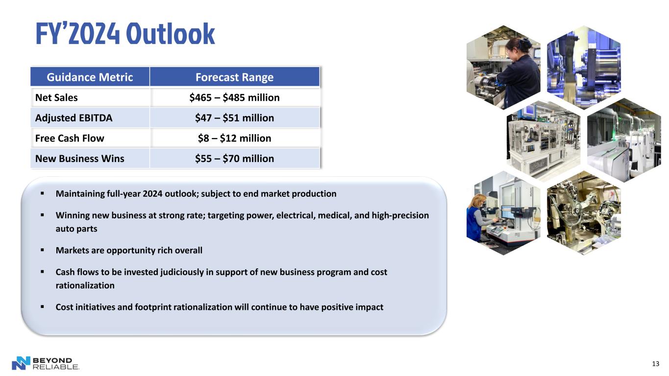 13 FY’2024 Outlook Guidance Metric Forecast Range Net Sales $465 – $485 million Adjusted EBITDA $47 – $51 million Free Cash Flow $8 – $12 million New Business Wins $55 – $70 million ▪ Maintaining full-year 2024 outlook; subject to end market production ▪ Winning new business at strong rate; targeting power, electrical, medical, and high-precision auto parts ▪ Markets are opportunity rich overall ▪ Cash flows to be invested judiciously in support of new business program and cost rationalization ▪ Cost initiatives and footprint rationalization will continue to have positive impact