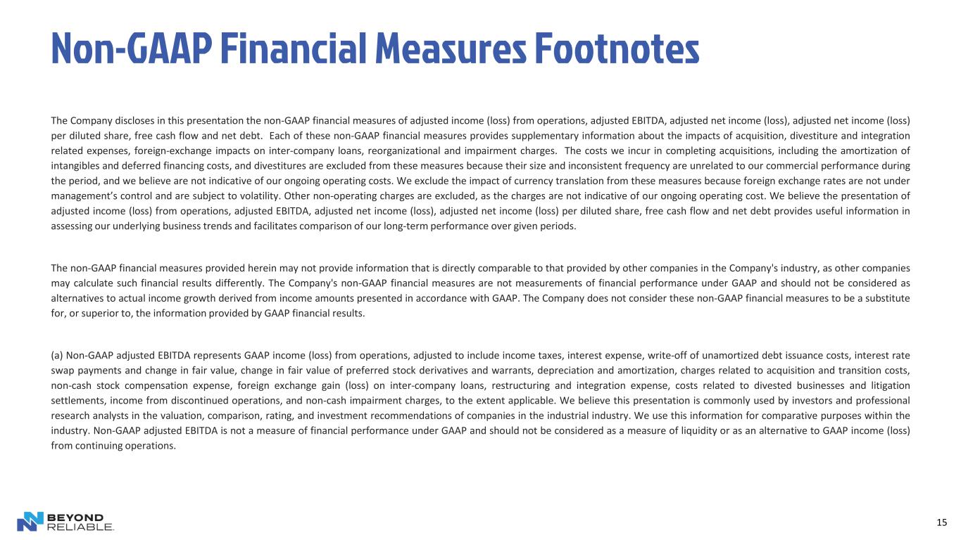 15 The Company discloses in this presentation the non-GAAP financial measures of adjusted income (loss) from operations, adjusted EBITDA, adjusted net income (loss), adjusted net income (loss) per diluted share, free cash flow and net debt. Each of these non-GAAP financial measures provides supplementary information about the impacts of acquisition, divestiture and integration related expenses, foreign-exchange impacts on inter-company loans, reorganizational and impairment charges. The costs we incur in completing acquisitions, including the amortization of intangibles and deferred financing costs, and divestitures are excluded from these measures because their size and inconsistent frequency are unrelated to our commercial performance during the period, and we believe are not indicative of our ongoing operating costs. We exclude the impact of currency translation from these measures because foreign exchange rates are not under management’s control and are subject to volatility. Other non-operating charges are excluded, as the charges are not indicative of our ongoing operating cost. We believe the presentation of adjusted income (loss) from operations, adjusted EBITDA, adjusted net income (loss), adjusted net income (loss) per diluted share, free cash flow and net debt provides useful information in assessing our underlying business trends and facilitates comparison of our long-term performance over given periods. The non-GAAP financial measures provided herein may not provide information that is directly comparable to that provided by other companies in the Company's industry, as other companies may calculate such financial results differently. The Company's non-GAAP financial measures are not measurements of financial performance under GAAP and should not be considered as alternatives to actual income growth derived from income amounts presented in accordance with GAAP. The Company does not consider these non-GAAP financial measures to be a substitute for, or superior to, the information provided by GAAP financial results. (a) Non-GAAP adjusted EBITDA represents GAAP income (loss) from operations, adjusted to include income taxes, interest expense, write-off of unamortized debt issuance costs, interest rate swap payments and change in fair value, change in fair value of preferred stock derivatives and warrants, depreciation and amortization, charges related to acquisition and transition costs, non-cash stock compensation expense, foreign exchange gain (loss) on inter-company loans, restructuring and integration expense, costs related to divested businesses and litigation settlements, income from discontinued operations, and non-cash impairment charges, to the extent applicable. We believe this presentation is commonly used by investors and professional research analysts in the valuation, comparison, rating, and investment recommendations of companies in the industrial industry. We use this information for comparative purposes within the industry. Non-GAAP adjusted EBITDA is not a measure of financial performance under GAAP and should not be considered as a measure of liquidity or as an alternative to GAAP income (loss) from continuing operations. Non-GAAP Financial Measures Footnotes