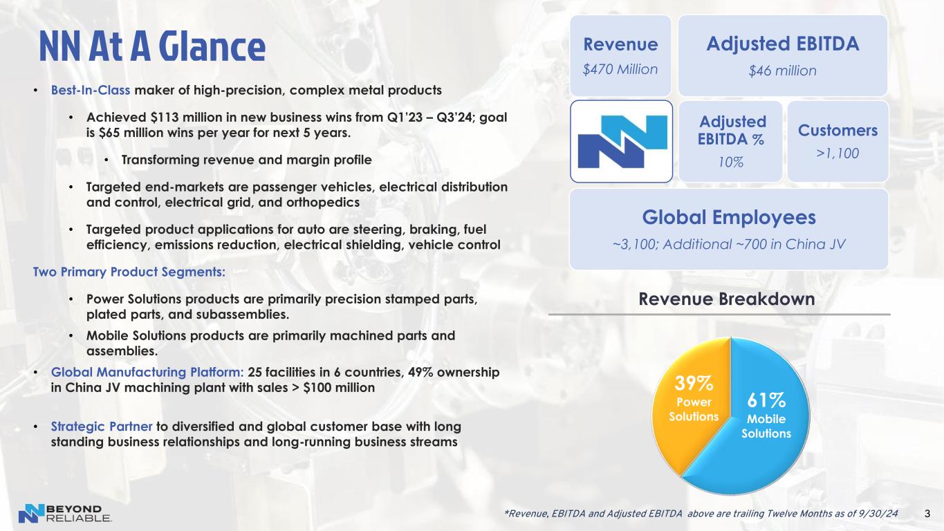 Except for specific historical information, many of the matters discussed in this presentation may express or imply projections of revenues or expenditures, statements of plans and objectives or future operations or statements of future economic performance. These statements may discuss goals, intentions and expectations as to future trends, plans, events, results of operations or financial condition, or state other information relating to NN, Inc. (the “Company”) based on current beliefs of management as well as assumptions made by, and information currently available to, management. Forward-looking statements generally will be accompanied by words such as “anticipate,” “believe,” “could,” “estimate,” “expect,” “forecast,” “guidance,” “intend,” “may,” “possible,” “potential,” “predict,” “project” or other similar words, phrases or expressions. Forward-looking statements involve a number of risks and uncertainties that are outside of management’s control and that may cause actual results to be materially different from such forward-looking statements. Such factors include, among others, general economic conditions and economic conditions in the industrial sector; the impacts of pandemics, epidemics, disease outbreaks and other public health crises on our financial condition, business operations and liquidity; competitive influences; risks that current customers will commence or increase captive production; risks of capacity underutilization; quality issues; material changes in the costs and availability of raw materials; economic, social, political and geopolitical instability, military conflict, currency fluctuation, and other risks of doing business outside of the United States; inflationary pressures and changes in the cost or availability of materials, supply chain shortages and disruptions, the availability of labor and labor disruptions along the supply chain; our dependence on certain major customers, some of whom are not parties to long-term agreements (and/or are terminable on short notice); the impact of acquisitions and divestitures, as well as expansion of end markets and product offerings; our ability to hire or retain key personnel; the level of our indebtedness; the restrictions contained in our debt agreements; our ability to obtain financing at favorable rates, if at all, and to refinance existing debt as it matures; our ability to secure, maintain or enforce patents or other appropriate protections for our intellectual property; new laws and governmental regulations; the impact of climate change on our operations; and cyber liability or potential liability for breaches of our or our service providers’ information technology systems or business operations disruptions. The foregoing factors should not be construed as exhaustive and should be read in conjunction with the sections entitled “Risk Factors” and “Management’s Discussion and Analysis of Financial Condition and Results of Operations” included in the Company’s filings made with the Securities and Exchange Commission. Any forward-looking statement speaks only as of the date of this press release, and the Company undertakes no obligation to publicly update or review any forward-looking statement, whether as a result of new information, future developments or otherwise, except as required by law. New risks and uncertainties may emerge from time to time, and it is not possible for the Company to predict their occurrence or how they will affect the Company. The Company qualifies all forward-looking statements by these cautionary statements. With respect to any non-GAAP financial measures included in the following presentation, the accompanying information required by SEC Regulation G can be found in the back of this document or in the “Investors” section of the Company’s web site, www.nninc.com, under the heading “News & Events” and subheading “Presentations.” Forward Looking Statement & Disclosures 2
