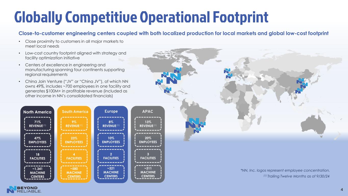 3 NN At A Glance *Revenue, EBITDA and Adjusted EBITDA above are trailing Twelve Months as of 9/30/24 • Best-In-Class maker of high-precision, complex metal products • Achieved $113 million in new business wins from Q1’23 – Q3’24; goal is $65 million wins per year for next 5 years. • Transforming revenue and margin profile • Targeted end-markets are passenger vehicles, electrical distribution and control, electrical grid, and orthopedics • Targeted product applications for auto are steering, braking, fuel efficiency, emissions reduction, electrical shielding, vehicle control Two Primary Product Segments: • Power Solutions products are primarily precision stamped parts, plated parts, and subassemblies. • Mobile Solutions products are primarily machined parts and assemblies. • Global Manufacturing Platform: 25 facilities in 6 countries, 49% ownership in China JV machining plant with sales > $100 million • Strategic Partner to diversified and global customer base with long standing business relationships and long-running business streams Revenue Breakdown 61% Mobile Solutions 39% Power Solutions Global Employees ~3,100; Additional ~700 in China JV Adjusted EBITDA $46 million Revenue $470 Million Adjusted EBITDA % 10% Customers >1,100