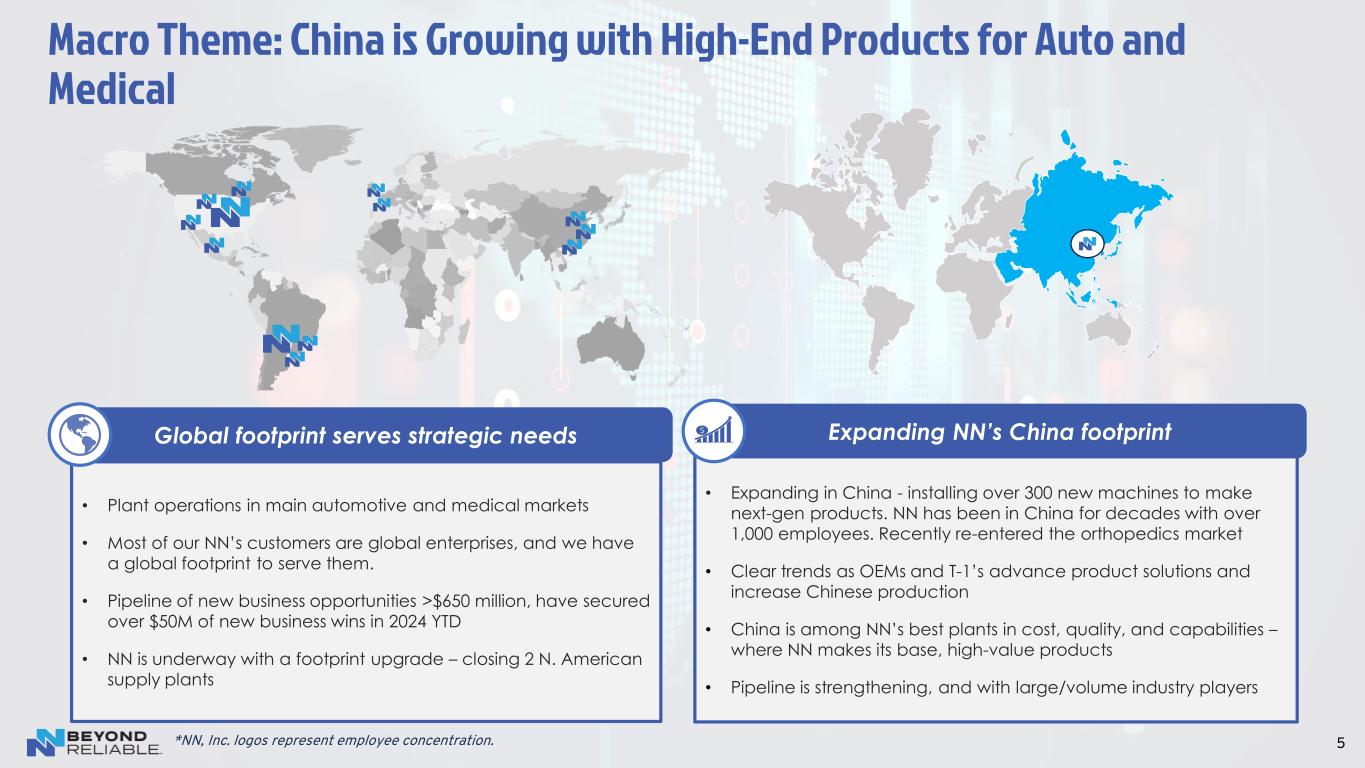 4 • Close proximity to customers in all major markets to meet local needs • Low-cost country footprint aligned with strategy and facility optimization initiative • Centers of excellence in engineering and manufacturing spanning four continents supporting regional requirements • China Join Venture (“JV” or “China JV”), of which NN owns 49%, includes ~700 employees in one facility and generates $100M+ in profitable revenue (included as other income in NN’s consolidated financials) Globally Competitive Operational Footprint North America 71% REVENUE (1) 47% EMPLOYEES 18 FACILITIES Europe 8% REVENUE (1) 10% EMPLOYEES 2 FACILITIES South America 9% REVENUE (1) 23% EMPLOYEES 4 FACILITIES APAC 13% REVENUE (1) 20% EMPLOYEES 3 FACILITIES (1) Trailing Twelve Months as of 9/30/24 *NN, Inc. logos represent employee concentration. Close-to-customer engineering centers coupled with both localized production for local markets and global low-cost footprint ~1,341 MACHINE CENTERS ~580 MACHINE CENTERS ~321 MACHINE CENTERS ~311 MACHINE CENTERS