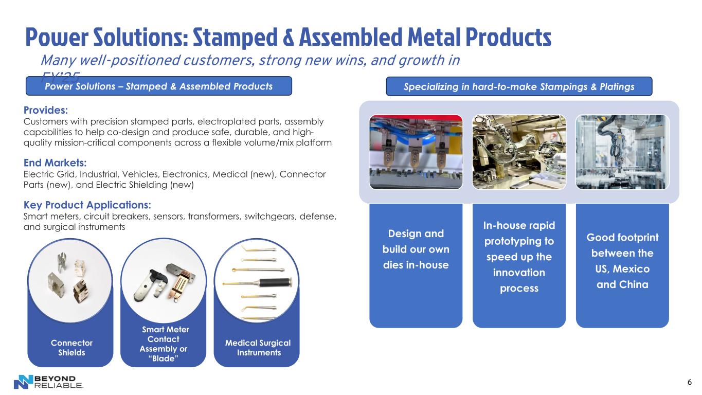 6 Power Solutions: Stamped & Assembled Metal Products Provides: Customers with precision stamped parts, electroplated parts, assembly capabilities to help co-design and produce safe, durable, and high- quality mission-critical components across a flexible volume/mix platform End Markets: Electric Grid, Industrial, Vehicles, Electronics, Medical (new), Connector Parts (new), and Electric Shielding (new) Key Product Applications: Smart meters, circuit breakers, sensors, transformers, switchgears, defense, and surgical instruments Connector Shields Smart Meter Contact Assembly or “Blade” Medical Surgical Instruments Power Solutions – Stamped & Assembled Products Specializing in hard-to-make Stampings & Platings Design and build our own dies in-house In-house rapid prototyping to speed up the innovation process Good footprint between the US, Mexico and China Many well-positioned customers, strong new wins, and growth in FY’25