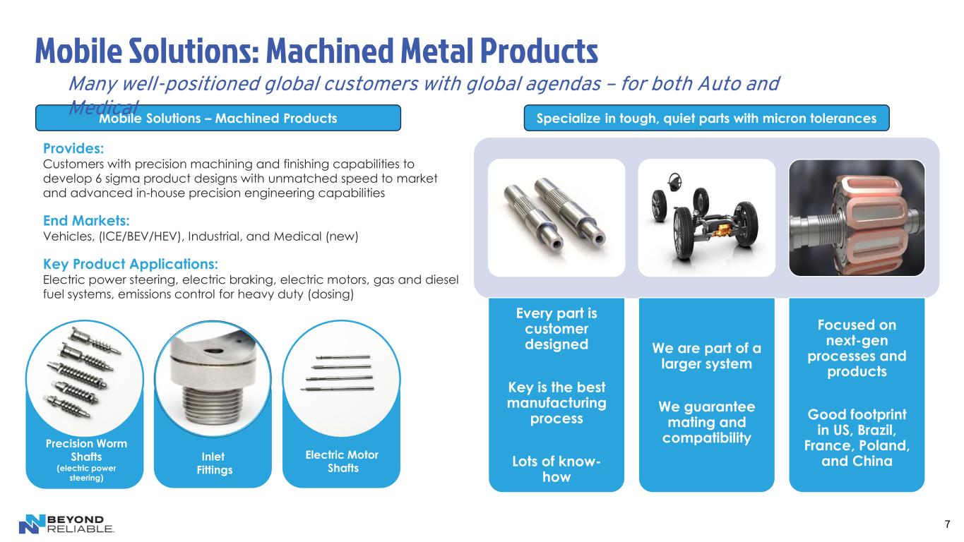 7 Mobile Solutions: Machined Metal Products Provides: Customers with precision machining and finishing capabilities to develop 6 sigma product designs with unmatched speed to market and advanced in-house precision engineering capabilities End Markets: Vehicles, (ICE/BEV/HEV), Industrial, and Medical (new) Key Product Applications: Electric power steering, electric braking, electric motors, gas and diesel fuel systems, emissions control for heavy duty (dosing) Precision Worm Shafts (electric power steering) Inlet Fittings Electric Motor Shafts Mobile Solutions – Machined Products Specialize in tough, quiet parts with micron tolerances Every part is customer designed Key is the best manufacturing process Lots of know- how We are part of a larger system We guarantee mating and compatibility Focused on next-gen processes and products Good footprint in US, Brazil, France, Poland, and China Many well-positioned global customers with global agendas – for both Auto and Medical