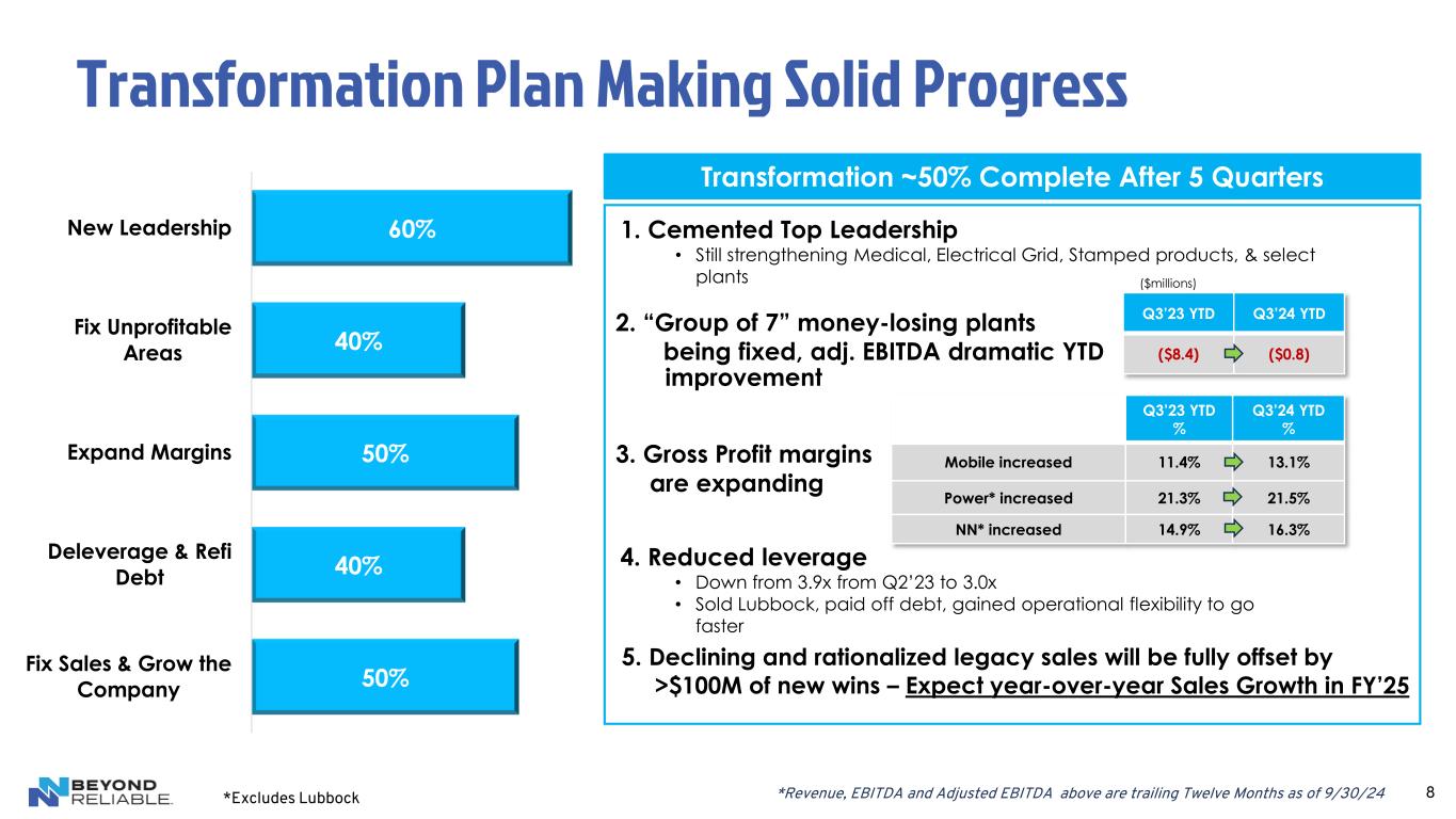 2. “Group of 7” money-losing plants being fixed, adj. EBITDA dramatic YTD 8 50% 40% 50% 40% 60% Fix Sales & Grow the Company Deleverage & Refi Debt Expand Margins Fix Unprofitable Areas New Leadership Q3’23 YTD Q3’24 YTD ($8.4) ($0.8) Q3’23 YTD % Q3’24 YTD % Mobile increased 11.4% 13.1% Power* increased 21.3% 21.5% NN* increased 14.9% 16.3% Transformation Plan Making Solid Progress 1. Cemented Top Leadership • Still strengthening Medical, Electrical Grid, Stamped products, & select plants 3. Gross Profit margins are expanding 4. Reduced leverage • Down from 3.9x from Q2’23 to 3.0x • Sold Lubbock, paid off debt, gained operational flexibility to go faster 5. Declining and rationalized legacy sales will be fully offset by >$100M of new wins – Expect year-over-year Sales Growth in FY’25 Transformation ~50% Complete After 5 Quarters ($millions) *Excludes Lubbock improvement *Revenue, EBITDA and Adjusted EBITDA above are trailing Twelve Months as of 9/30/24