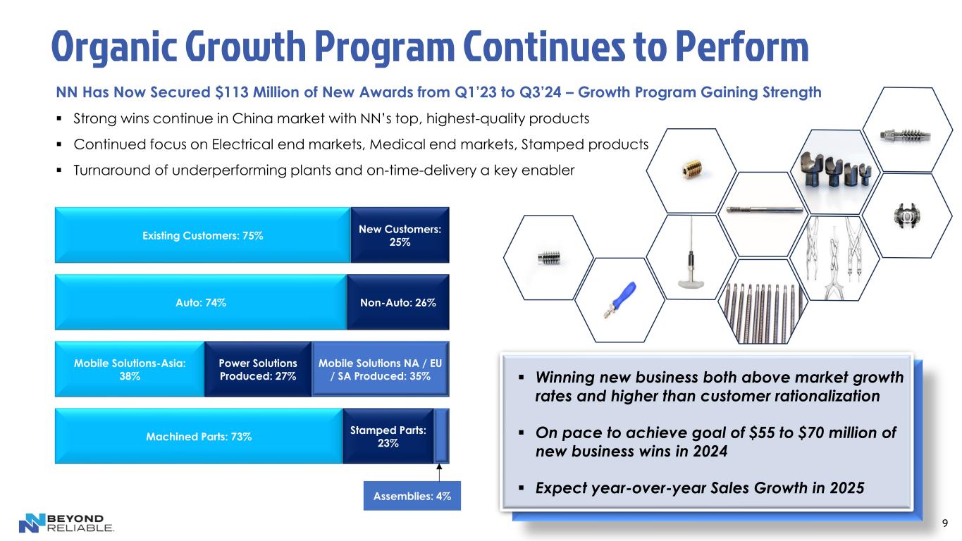 Organic Growth Program Continues to Perform 9 NN Has Now Secured $113 Million of New Awards from Q1’23 to Q3’24 – Growth Program Gaining Strength ▪ Strong wins continue in China market with NN’s top, highest-quality products ▪ Continued focus on Electrical end markets, Medical end markets, Stamped products ▪ Turnaround of underperforming plants and on-time-delivery a key enabler ▪ Winning new business both above market growth rates and higher than customer rationalization ▪ On pace to achieve goal of $55 to $70 million of new business wins in 2024 ▪ Expect year-over-year Sales Growth in 2025 Machined Parts: 73% Mobile Solutions-Asia: 38% Auto: 74% Existing Customers: 75% Stamped Parts: 23% Power Solutions Produced: 27% Non-Auto: 26% New Customers: 25% Mobile Solutions NA / EU / SA Produced: 35% Assemblies: 4%