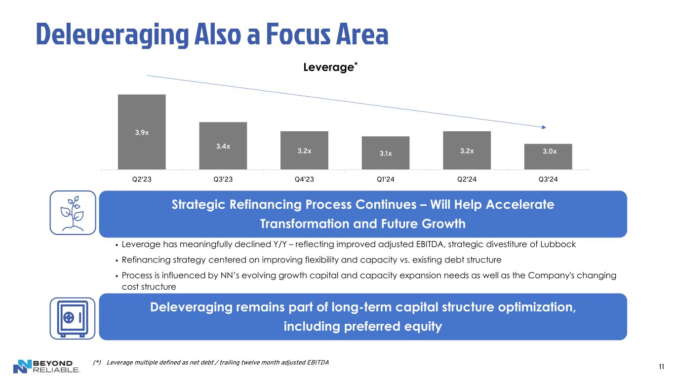 3.9x 3.4x 3.2x 3.1x 3.2x 3.0x Q2'23 Q3'23 Q4'23 Q1'24 Q2'24 Q3'24 Leverage* 11 Deleveraging Also a Focus Area (*) Leverage multiple defined as net debt / trailing twelve month adjusted EBITDA Strategic Refinancing Process Continues – Will Help Accelerate Transformation and Future Growth ▪ Leverage has meaningfully declined Y/Y – reflecting improved adjusted EBITDA, strategic divestiture of Lubbock ▪ Refinancing strategy centered on improving flexibility and capacity vs. existing debt structure ▪ Process is influenced by NN’s evolving growth capital and capacity expansion needs as well as the Company's changing cost structure Deleveraging remains part of long-term capital structure optimization, including preferred equity