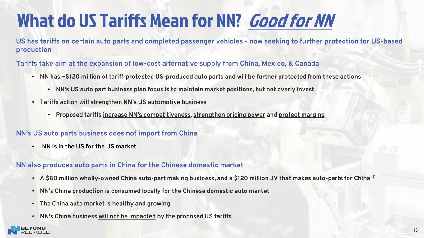 13 What do US Tariffs Mean for NN? Good for NN US has tariffs on certain auto parts and completed passenger vehicles - now seeking to further protection for US-based production Tariffs take aim at the expansion of low-cost alternative supply from China, Mexico, & Canada • NN has ~$120 million of tariff-protected US-produced auto parts and will be further protected from these actions • NN's US auto part business plan focus is to maintain market positions, but not overly invest • Tariffs action will strengthen NN’s US automotive business • Proposed tariffs increase NN’s competitiveness, strengthen pricing power and protect margins NN’s US auto parts business does not import from China • NN is in the US for the US market NN also produces auto parts in China for the Chinese domestic market • A $80 million wholly-owned China auto-part making business, and a $120 million JV that makes auto-parts for China (1) • NN’s China production is consumed locally for the Chinese domestic auto market • The China auto market is healthy and growing • NN's China business will not be impacted by the proposed US tariffs