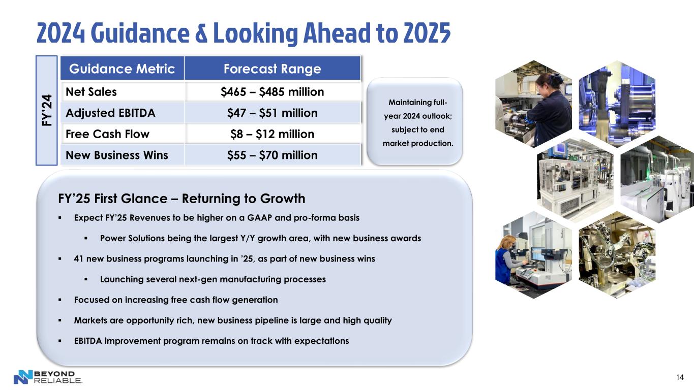 14 2024 Guidance & Looking Ahead to 2025 Guidance Metric Forecast Range Net Sales $465 – $485 million Adjusted EBITDA $47 – $51 million Free Cash Flow $8 – $12 million New Business Wins $55 – $70 million FY’25 First Glance – Returning to Growth ▪ Expect FY’25 Revenues to be higher on a GAAP and pro-forma basis ▪ Power Solutions being the largest Y/Y growth area, with new business awards ▪ 41 new business programs launching in ’25, as part of new business wins ▪ Launching several next-gen manufacturing processes ▪ Focused on increasing free cash flow generation ▪ Markets are opportunity rich, new business pipeline is large and high quality ▪ EBITDA improvement program remains on track with expectations F Y ’2 4 Maintaining full- year 2024 outlook; subject to end market production.