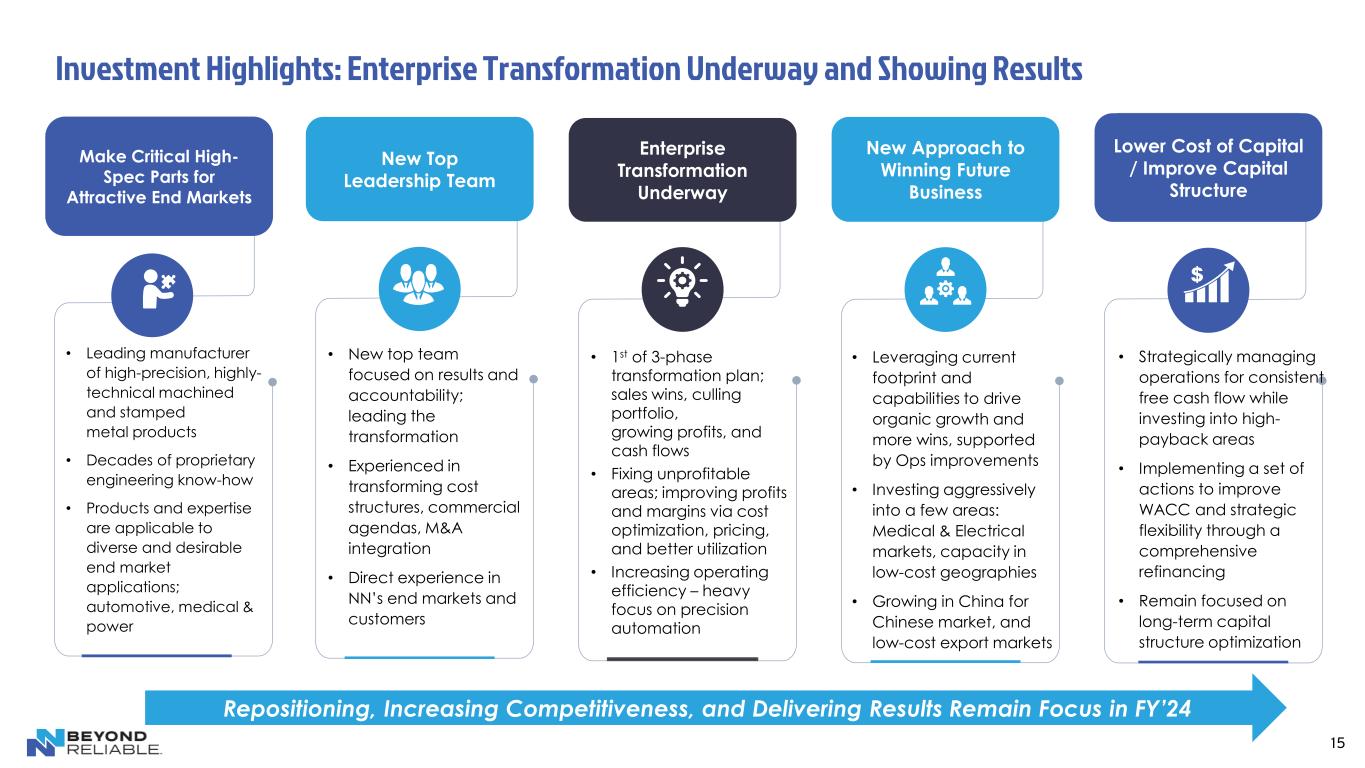 • Leveraging current footprint and capabilities to drive organic growth and more wins, supported by Ops improvements • Investing aggressively into a few areas: Medical & Electrical markets, capacity in low-cost geographies • Growing in China for Chinese market, and low-cost export markets New Approach to Winning Future Business • 1st of 3-phase transformation plan; sales wins, culling portfolio, growing profits, and cash flows • Fixing unprofitable areas; improving profits and margins via cost optimization, pricing, and better utilization • Increasing operating efficiency – heavy focus on precision automation Enterprise Transformation Underway • New top team focused on results and accountability; leading the transformation • Experienced in transforming cost structures, commercial agendas, M&A integration • Direct experience in NN’s end markets and customers New Top Leadership Team 15 • Leading manufacturer of high-precision, highly- technical machined and stamped metal products • Decades of proprietary engineering know-how • Products and expertise are applicable to diverse and desirable end market applications; automotive, medical & power Make Critical High- Spec Parts for Attractive End Markets • Strategically managing operations for consistent free cash flow while investing into high- payback areas • Implementing a set of actions to improve WACC and strategic flexibility through a comprehensive refinancing • Remain focused on long-term capital structure optimization Lower Cost of Capital / Improve Capital Structure Investment Highlights: Enterprise Transformation Underway and Showing Results Repositioning, Increasing Competitiveness, and Delivering Results Remain Focus in FY’24