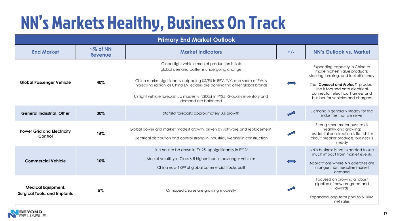 17 NN’s Markets Healthy, Business On Track Primary End Market Outlook End Market ~% of NN Revenue Market Indicators +/- NN’s Outlook vs. Market Global Passenger Vehicle 40% Global light vehicle market production is flat; global demand patterns undergoing change China market significantly outpacing US/EU in BEV, Y/Y, and share of EVs is increasing rapidly as China EV leaders are dominating other global brands US light vehicle forecast up modestly (LSD%) in FY25; Globally inventory and demand are balanced Expanding capacity in China to make highest value products; steering, braking, and fuel efficiency The ‘Connect and Protect’ product line is focused onto electrical connector, electrical harness and bus bar for vehicles and chargers General Industrial, Other 30% Statista forecasts approximately 3% growth Demand is generally steady for the industries that we serve Power Grid and Electricity Control 15% Global power grid market modest growth, driven by software and replacement Electrical distribution and control strong in Industrial, weaker in construction Strong smart meter business is healthy and growing; residential construction is flat-ish for circuit breaker products, business is steady Commercial Vehicle 10% Line haul to be down in FY’25, up significantly in FY’26 Market volatility in Class 6-8 higher than in passenger vehicles China now 1/3rd of global commercial trucks built NN’s business is not expected to see much impact from market events Applications where NN operates are stronger than headline market demand Medical Equipment, Surgical Tools, and Implants 5% Orthopedic sales are growing modestly Focused on growing a robust pipeline of new programs and awards Expanded long-term goal to $100M net sales