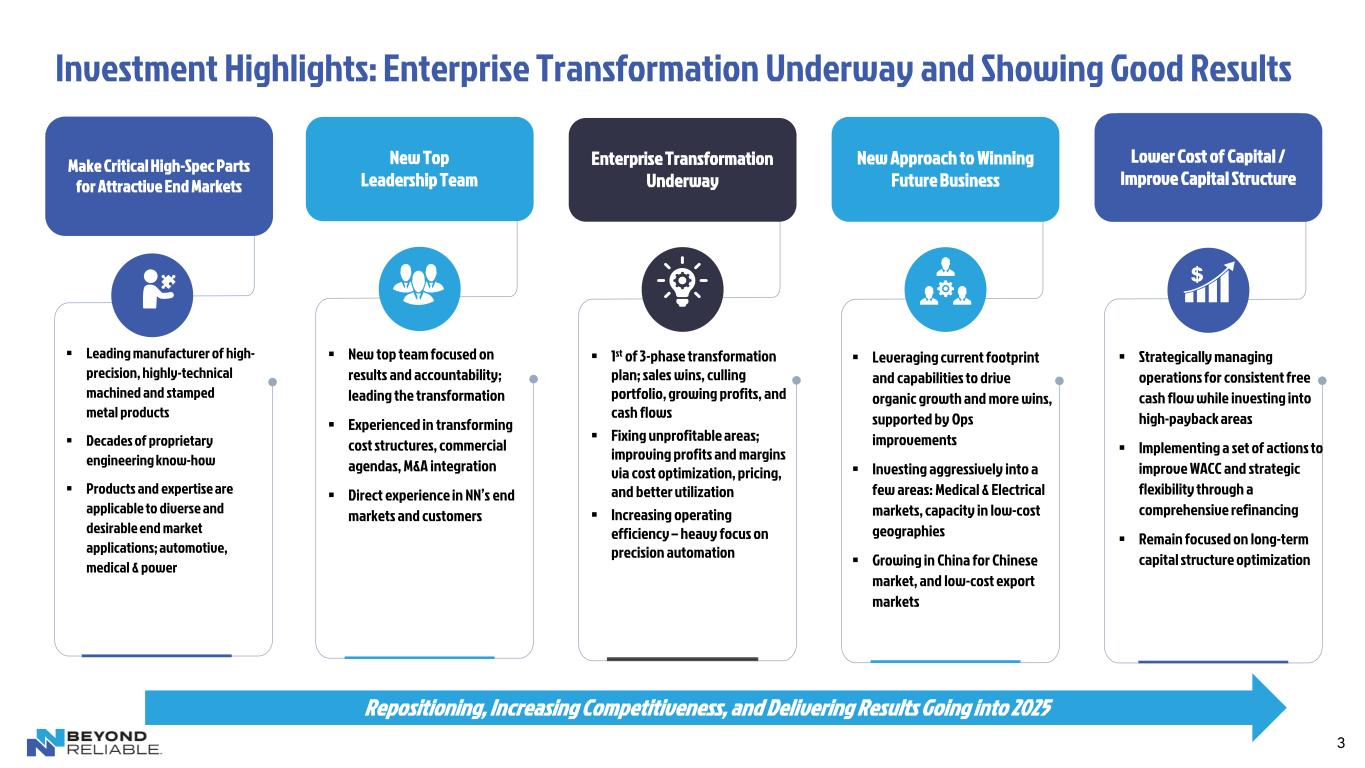 Except for specific historical information, many of the matters discussed in this presentation may express or imply projections of revenues or expenditures, statements of plans and objectives or future operations or statements of future economic performance. These statements may discuss goals, intentions and expectations as to future trends, plans, events, results of operations or financial condition, or state other information relating to NN, Inc. (the “Company”) based on current beliefs of management as well as assumptions made by, and information currently available to, management. Forward-looking statements generally will be accompanied by words such as “anticipate,” “believe,” “could,” “estimate,” “expect,” “forecast,” “guidance,” “intend,” “may,” “possible,” “potential,” “predict,” “project” or other similar words, phrases or expressions. Forward-looking statements involve a number of risks and uncertainties that are outside of management’s control and that may cause actual results to be materially different from such forward-looking statements. Such factors include, among others, general economic conditions and economic conditions in the industrial sector; the impacts of pandemics, epidemics, disease outbreaks and other public health crises on our financial condition, business operations and liquidity; competitive influences; risks that current customers will commence or increase captive production; risks of capacity underutilization; quality issues; material changes in the costs and availability of raw materials; economic, social, political and geopolitical instability, military conflict, currency fluctuation, and other risks of doing business outside of the United States; inflationary pressures and changes in the cost or availability of materials, supply chain shortages and disruptions, the availability of labor and labor disruptions along the supply chain; our dependence on certain major customers, some of whom are not parties to long-term agreements (and/or are terminable on short notice); the impact of acquisitions and divestitures, as well as expansion of end markets and product offerings; our ability to hire or retain key personnel; the level of our indebtedness; the restrictions contained in our debt agreements; our ability to obtain financing at favorable rates, if at all, and to refinance existing debt as it matures; our ability to secure, maintain or enforce patents or other appropriate protections for our intellectual property; new laws and governmental regulations; the impact of climate change on our operations; and cyber liability or potential liability for breaches of our or our service providers’ information technology systems or business operations disruptions. The foregoing factors should not be construed as exhaustive and should be read in conjunction with the sections entitled “Risk Factors” and “Management’s Discussion and Analysis of Financial Condition and Results of Operations” included in the Company’s filings made with the Securities and Exchange Commission. Any forward-looking statement speaks only as of the date of this press release, and the Company undertakes no obligation to publicly update or review any forward-looking statement, whether as a result of new information, future developments or otherwise, except as required by law. New risks and uncertainties may emerge from time to time, and it is not possible for the Company to predict their occurrence or how they will affect the Company. The Company qualifies all forward-looking statements by these cautionary statements. With respect to any non-GAAP financial measures included in the following presentation, the accompanying information required by SEC Regulation G can be found in the back of this document or in the “Investors” section of the Company’s web site, www.nninc.com, under the heading “News & Events” and subheading “Presentations.” Forward Looking Statement & Disclosures 2