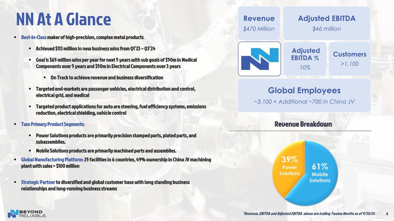 Investment Highlights: Enterprise Transformation Underway and Showing Good Results ▪ Leveraging current footprint and capabilities to drive organic growth and more wins, supported by Ops improvements ▪ Investing aggressively into a few areas: Medical & Electrical markets, capacity in low-cost geographies ▪ Growing in China for Chinese market, and low-cost export markets New Approach to Winning Future Business ▪ 1st of 3-phase transformation plan; sales wins, culling portfolio, growing profits, and cash flows ▪ Fixing unprofitable areas; improving profits and margins via cost optimization, pricing, and better utilization ▪ Increasing operating efficiency – heavy focus on precision automation Enterprise Transformation Underway ▪ New top team focused on results and accountability; leading the transformation ▪ Experienced in transforming cost structures, commercial agendas, M&A integration ▪ Direct experience in NN’s end markets and customers New Top Leadership Team 3 ▪ Leading manufacturer of high- precision, highly-technical machined and stamped metal products ▪ Decades of proprietary engineering know-how ▪ Products and expertise are applicable to diverse and desirable end market applications; automotive, medical & power Make Critical High-Spec Parts for Attractive End Markets ▪ Strategically managing operations for consistent free cash flow while investing into high-payback areas ▪ Implementing a set of actions to improve WACC and strategic flexibility through a comprehensive refinancing ▪ Remain focused on long-term capital structure optimization Lower Cost of Capital / Improve Capital Structure Repositioning, Increasing Competitiveness, and Delivering Results Going into 2025
