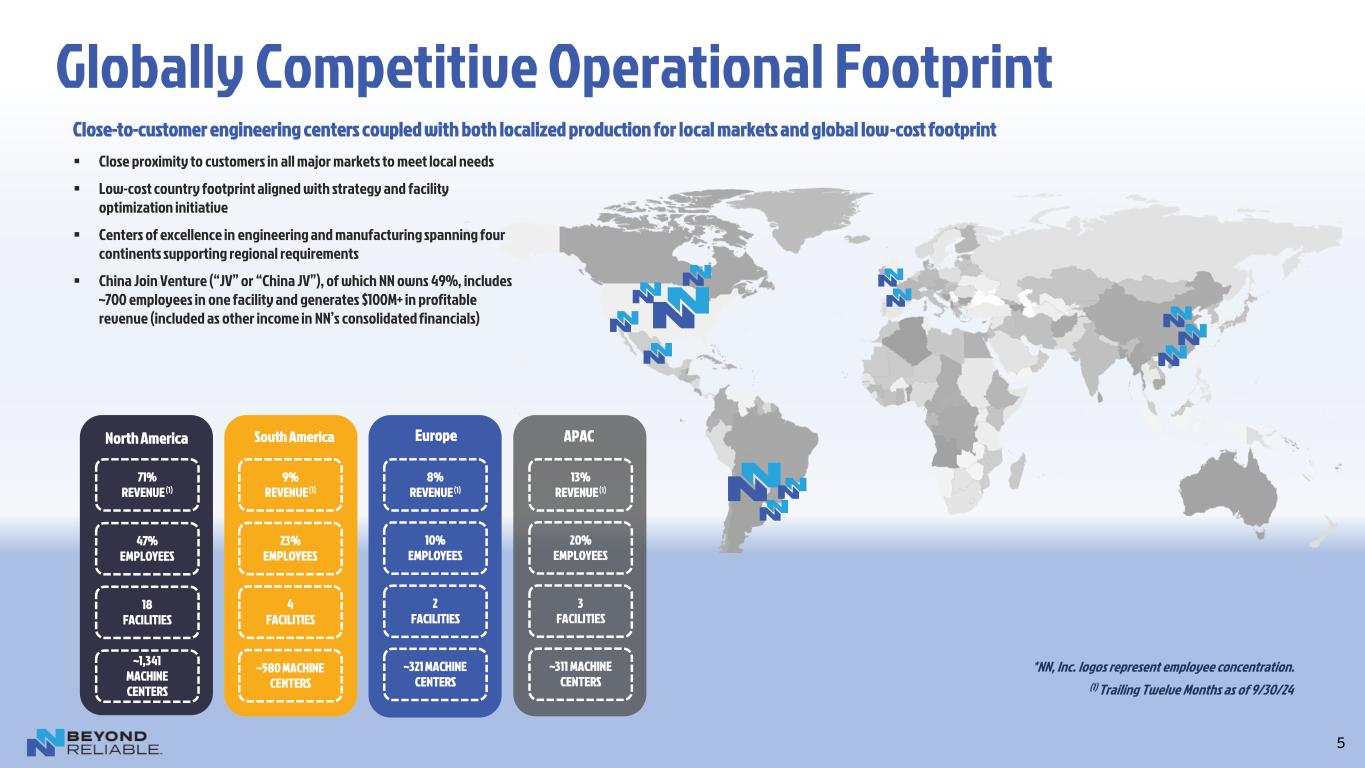 4 NN At A Glance *Revenue, EBITDA and Adjusted EBITDA above are trailing Twelve Months as of 9/30/24 ▪ Best-In-Class maker of high-precision, complex metal products ▪ Achieved $113 million in new business wins from Q1’23 – Q3’24 ▪ Goal is $65 million wins per year for next 5 years with sub goals of $50m in Medical Components over 5 years and $50m in Electrical Components over 3 years ▪ On Track to achieve revenue and business diversification ▪ Targeted end-markets are passenger vehicles, electrical distribution and control, electrical grid, and medical ▪ Targeted product applications for auto are steering, fuel efficiency systems, emissions reduction, electrical shielding, vehicle control ▪ Two Primary Product Segments: ▪ Power Solutions products are primarily precision stamped parts, plated parts, and subassemblies. ▪ Mobile Solutions products are primarily machined parts and assemblies. ▪ Global Manufacturing Platform: 25 facilities in 6 countries, 49% ownership in China JV machining plant with sales > $100 million ▪ Strategic Partner to diversified and global customer base with long standing business relationships and long-running business streams Revenue Breakdown 61% Mobile Solutions 39% Power Solutions Global Employees ~3,100 + Additional ~700 in China JV Adjusted EBITDA $46 million Revenue $470 Million Adjusted EBITDA % 10% Customers >1,100