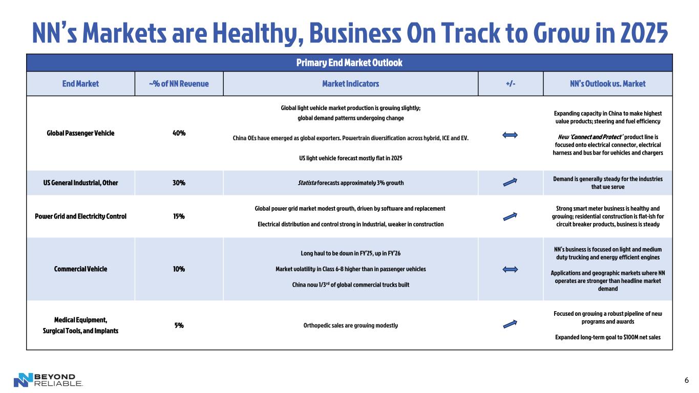 6 NN’s Markets are Healthy, Business On Track to Grow in 2025 Primary End Market Outlook End Market ~% of NN Revenue Market Indicators +/- NN’s Outlook vs. Market Global Passenger Vehicle 40% Global light vehicle market production is growing slightly; global demand patterns undergoing change China OEs have emerged as global exporters. Powertrain diversification across hybrid, ICE and EV. US light vehicle forecast mostly flat in 2025 Expanding capacity in China to make highest value products; steering and fuel efficiency New ‘Connect and Protect’ product line is focused onto electrical connector, electrical harness and bus bar for vehicles and chargers US General Industrial, Other 30% Statista forecasts approximately 3% growth Demand is generally steady for the industries that we serve Power Grid and Electricity Control 15% Global power grid market modest growth, driven by software and replacement Electrical distribution and control strong in Industrial, weaker in construction Strong smart meter business is healthy and growing; residential construction is flat-ish for circuit breaker products, business is steady Commercial Vehicle 10% Long haul to be down in FY’25, up in FY’26 Market volatility in Class 6-8 higher than in passenger vehicles China now 1/3rd of global commercial trucks built NN’s business is focused on light and medium duty trucking and energy efficient engines Applications and geographic markets where NN operates are stronger than headline market demand Medical Equipment, Surgical Tools, and Implants 5% Orthopedic sales are growing modestly Focused on growing a robust pipeline of new programs and awards Expanded long-term goal to $100M net sales