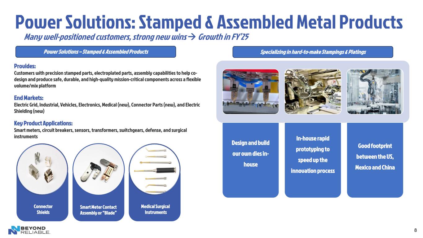 8 Power Solutions: Stamped & Assembled Metal Products Provides: Customers with precision stamped parts, electroplated parts, assembly capabilities to help co- design and produce safe, durable, and high-quality mission-critical components across a flexible volume/mix platform End Markets: Electric Grid, Industrial, Vehicles, Electronics, Medical (new), Connector Parts (new), and Electric Shielding (new) Key Product Applications: Smart meters, circuit breakers, sensors, transformers, switchgears, defense, and surgical instruments Connector Shields Smart Meter Contact Assembly or “Blade” Medical Surgical Instruments Power Solutions – Stamped & Assembled Products Specializing in hard-to-make Stampings & Platings Design and build our own dies in- house In-house rapid prototyping to speed up the innovation process Good footprint between the US, Mexico and China Many well-positioned customers, strong new wins → Growth in FY’25