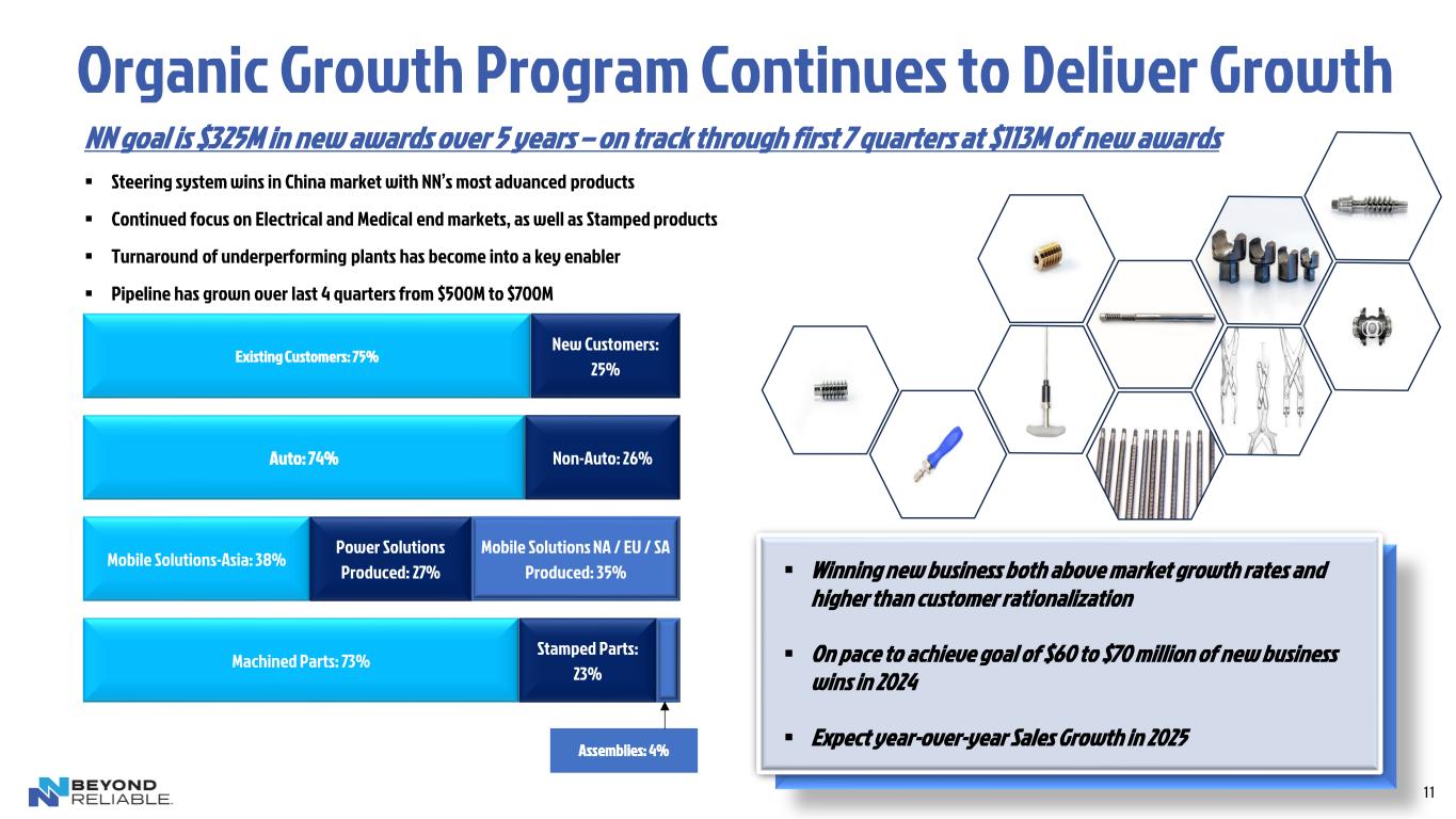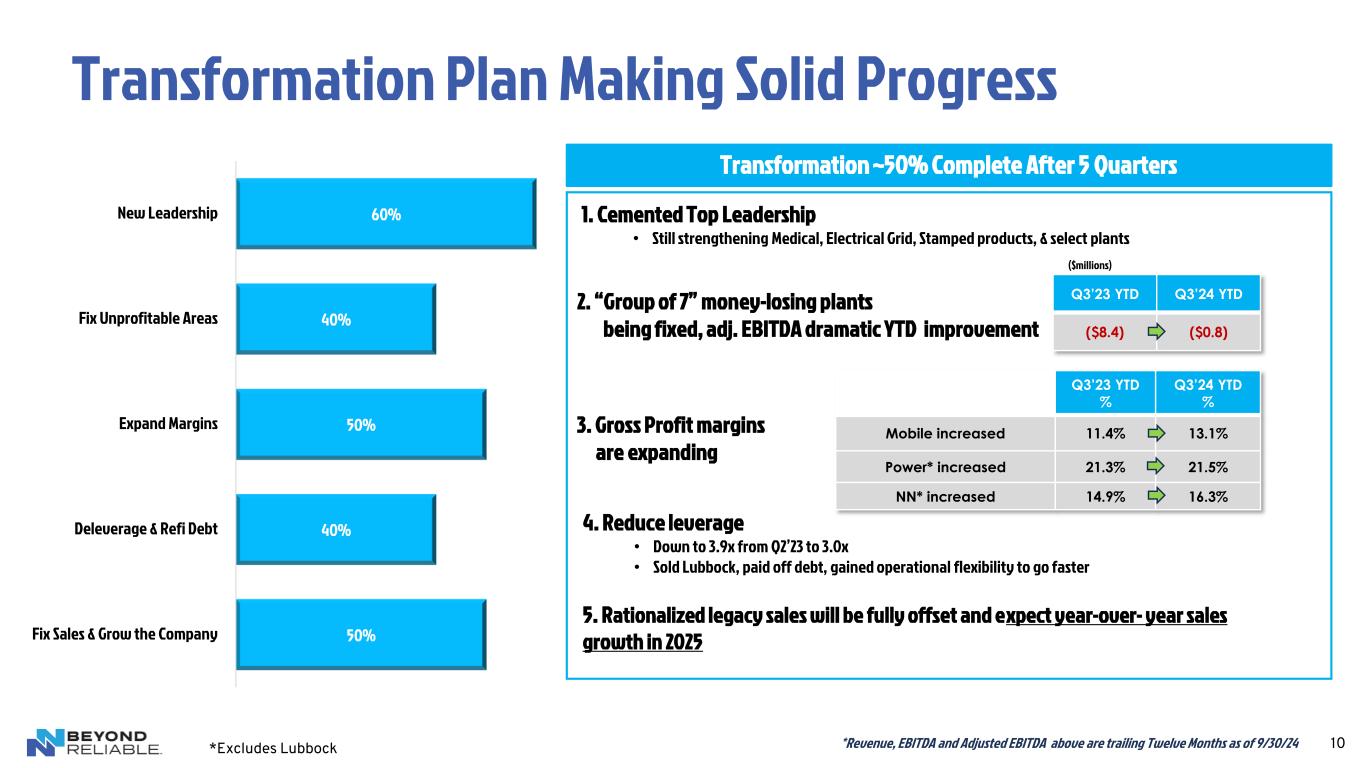 2. “Group of 7” money-losing plants being fixed, adj. EBITDA dramatic YTD improvement 10 50% 40% 50% 40% 60% Fix Sales & Grow the Company Deleverage & Refi Debt Expand Margins Fix Unprofitable Areas New Leadership Q3’23 YTD Q3’24 YTD ($8.4) ($0.8) Q3’23 YTD % Q3’24 YTD % Mobile increased 11.4% 13.1% Power* increased 21.3% 21.5% NN* increased 14.9% 16.3% Transformation Plan Making Solid Progress 1. Cemented Top Leadership • Still strengthening Medical, Electrical Grid, Stamped products, & select plants 3. Gross Profit margins are expanding 4. Reduce leverage • Down to 3.9x from Q2’23 to 3.0x • Sold Lubbock, paid off debt, gained operational flexibility to go faster 5. Rationalized legacy sales will be fully offset and expect year-over- year sales growth in 2025 Transformation ~50% Complete After 5 Quarters ($millions) *Excludes Lubbock *Revenue, EBITDA and Adjusted EBITDA above are trailing Twelve Months as of 9/30/24