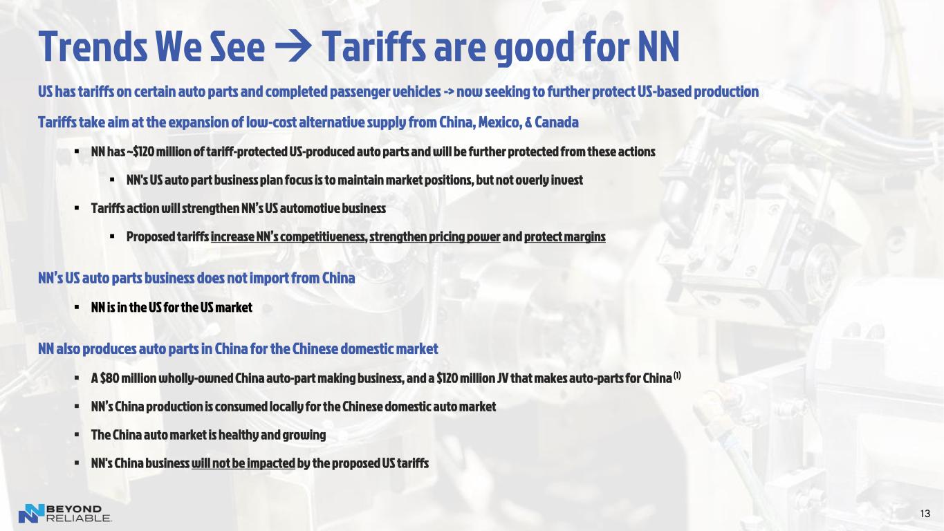 13 Trends We See → Tariffs are good for NN US has tariffs on certain auto parts and completed passenger vehicles -> now seeking to further protect US-based production Tariffs take aim at the expansion of low-cost alternative supply from China, Mexico, & Canada ▪ NN has ~$120 million of tariff-protected US-produced auto parts and will be further protected from these actions ▪ NN's US auto part business plan focus is to maintain market positions, but not overly invest ▪ Tariffs action will strengthen NN’s US automotive business ▪ Proposed tariffs increase NN’s competitiveness, strengthen pricing power and protect margins NN’s US auto parts business does not import from China ▪ NN is in the US for the US market NN also produces auto parts in China for the Chinese domestic market ▪ A $80 million wholly-owned China auto-part making business, and a $120 million JV that makes auto-parts for China (1) ▪ NN’s China production is consumed locally for the Chinese domestic auto market ▪ The China auto market is healthy and growing ▪ NN's China business will not be impacted by the proposed US tariffs