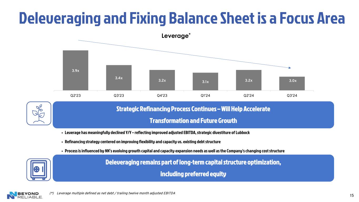 3.9x 3.4x 3.2x 3.1x 3.2x 3.0x Q2'23 Q3'23 Q4'23 Q1'24 Q2'24 Q3'24 Leverage* 15 Deleveraging and Fixing Balance Sheet is a Focus Area (*) Leverage multiple defined as net debt / trailing twelve month adjusted EBITDA Strategic Refinancing Process Continues – Will Help Accelerate Transformation and Future Growth ▪ Leverage has meaningfully declined Y/Y – reflecting improved adjusted EBITDA, strategic divestiture of Lubbock ▪ Refinancing strategy centered on improving flexibility and capacity vs. existing debt structure ▪ Process is influenced by NN’s evolving growth capital and capacity expansion needs as well as the Company's changing cost structure Deleveraging remains part of long-term capital structure optimization, including preferred equity