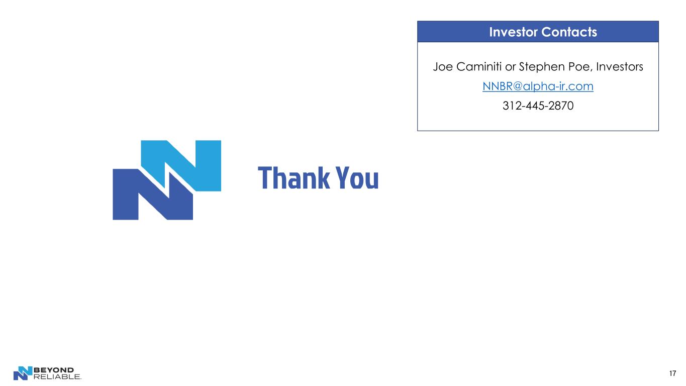 Thank You 17 Joe Caminiti or Stephen Poe, Investors NNBR@alpha-ir.com 312-445-2870 Investor Contacts