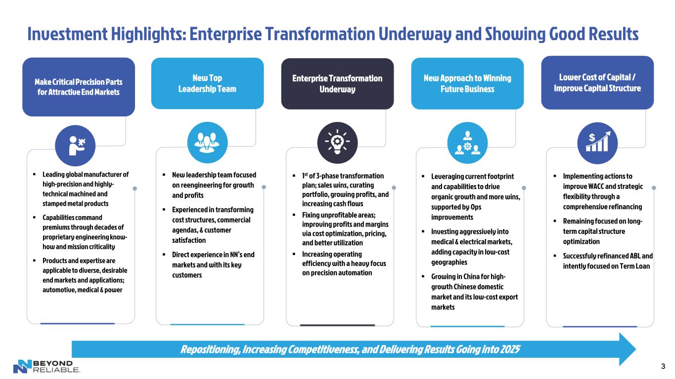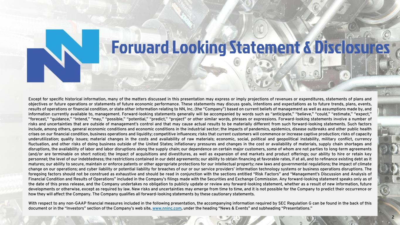 Except for specific historical information, many of the matters discussed in this presentation may express or imply projections of revenues or expenditures, statements of plans and objectives or future operations or statements of future economic performance. These statements may discuss goals, intentions and expectations as to future trends, plans, events, results of operations or financial condition, or state other information relating to NN, Inc. (the “Company”) based on current beliefs of management as well as assumptions made by, and information currently available to, management. Forward-looking statements generally will be accompanied by words such as “anticipate,” “believe,” “could,” “estimate,” “expect,” “forecast,” “guidance,” “intend,” “may,” “possible,” “potential,” “predict,” “project” or other similar words, phrases or expressions. Forward-looking statements involve a number of risks and uncertainties that are outside of management’s control and that may cause actual results to be materially different from such forward-looking statements. Such factors include, among others, general economic conditions and economic conditions in the industrial sector; the impacts of pandemics, epidemics, disease outbreaks and other public health crises on our financial condition, business operations and liquidity; competitive influences; risks that current customers will commence or increase captive production; risks of capacity underutilization; quality issues; material changes in the costs and availability of raw materials; economic, social, political and geopolitical instability, military conflict, currency fluctuation, and other risks of doing business outside of the United States; inflationary pressures and changes in the cost or availability of materials, supply chain shortages and disruptions, the availability of labor and labor disruptions along the supply chain; our dependence on certain major customers, some of whom are not parties to long-term agreements (and/or are terminable on short notice); the impact of acquisitions and divestitures, as well as expansion of end markets and product offerings; our ability to hire or retain key personnel; the level of our indebtedness; the restrictions contained in our debt agreements; our ability to obtain financing at favorable rates, if at all, and to refinance existing debt as it matures; our ability to secure, maintain or enforce patents or other appropriate protections for our intellectual property; new laws and governmental regulations; the impact of climate change on our operations; and cyber liability or potential liability for breaches of our or our service providers’ information technology systems or business operations disruptions. The foregoing factors should not be construed as exhaustive and should be read in conjunction with the sections entitled “Risk Factors” and “Management’s Discussion and Analysis of Financial Condition and Results of Operations” included in the Company’s filings made with the Securities and Exchange Commission. Any forward-looking statement speaks only as of the date of this press release, and the Company undertakes no obligation to publicly update or review any forward-looking statement, whether as a result of new information, future developments or otherwise, except as required by law. New risks and uncertainties may emerge from time to time, and it is not possible for the Company to predict their occurrence or how they will affect the Company. The Company qualifies all forward-looking statements by these cautionary statements. With respect to any non-GAAP financial measures included in the following presentation, the accompanying information required by SEC Regulation G can be found in the back of this document or in the “Investors” section of the Company’s web site, www.nninc.com, under the heading “News & Events” and subheading “Presentations.” Forward Looking Statement & Disclosures 2