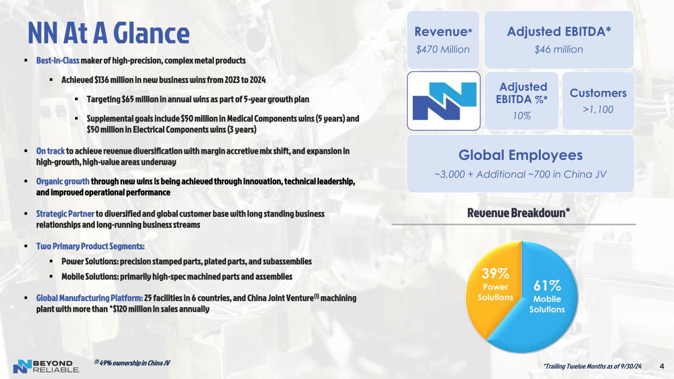 Investment Highlights: Enterprise Transformation Underway and Showing Good Results ▪ Leveraging current footprint and capabilities to drive organic growth and more wins, supported by Ops improvements ▪ Investing aggressively into medical & electrical markets, adding capacity in low-cost geographies ▪ Growing in China for high- growth Chinese domestic market and its low-cost export markets New Approach to Winning Future Business ▪ 1st of 3-phase transformation plan; sales wins, curating portfolio, growing profits, and increasing cash flows ▪ Fixing unprofitable areas; improving profits and margins via cost optimization, pricing, and better utilization ▪ Increasing operating efficiency with a heavy focus on precision automation Enterprise Transformation Underway ▪ New leadership team focused on reengineering for growth and profits ▪ Experienced in transforming cost structures, commercial agendas, & customer satisfaction ▪ Direct experience in NN’s end markets and with its key customers New Top Leadership Team 3 ▪ Leading global manufacturer of high-precision and highly- technical machined and stamped metal products ▪ Capabilities command premiums through decades of proprietary engineering know- how and mission criticality ▪ Products and expertise are applicable to diverse, desirable end markets and applications; automotive, medical & power Make Critical Precision Parts for Attractive End Markets ▪ Implementing actions to improve WACC and strategic flexibility through a comprehensive refinancing ▪ Remaining focused on long- term capital structure optimization ▪ Successfuly refinanced ABL and intently focused on Term Loan Lower Cost of Capital / Improve Capital Structure Repositioning, Increasing Competitiveness, and Delivering Results Going into 2025