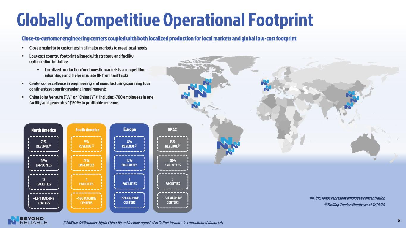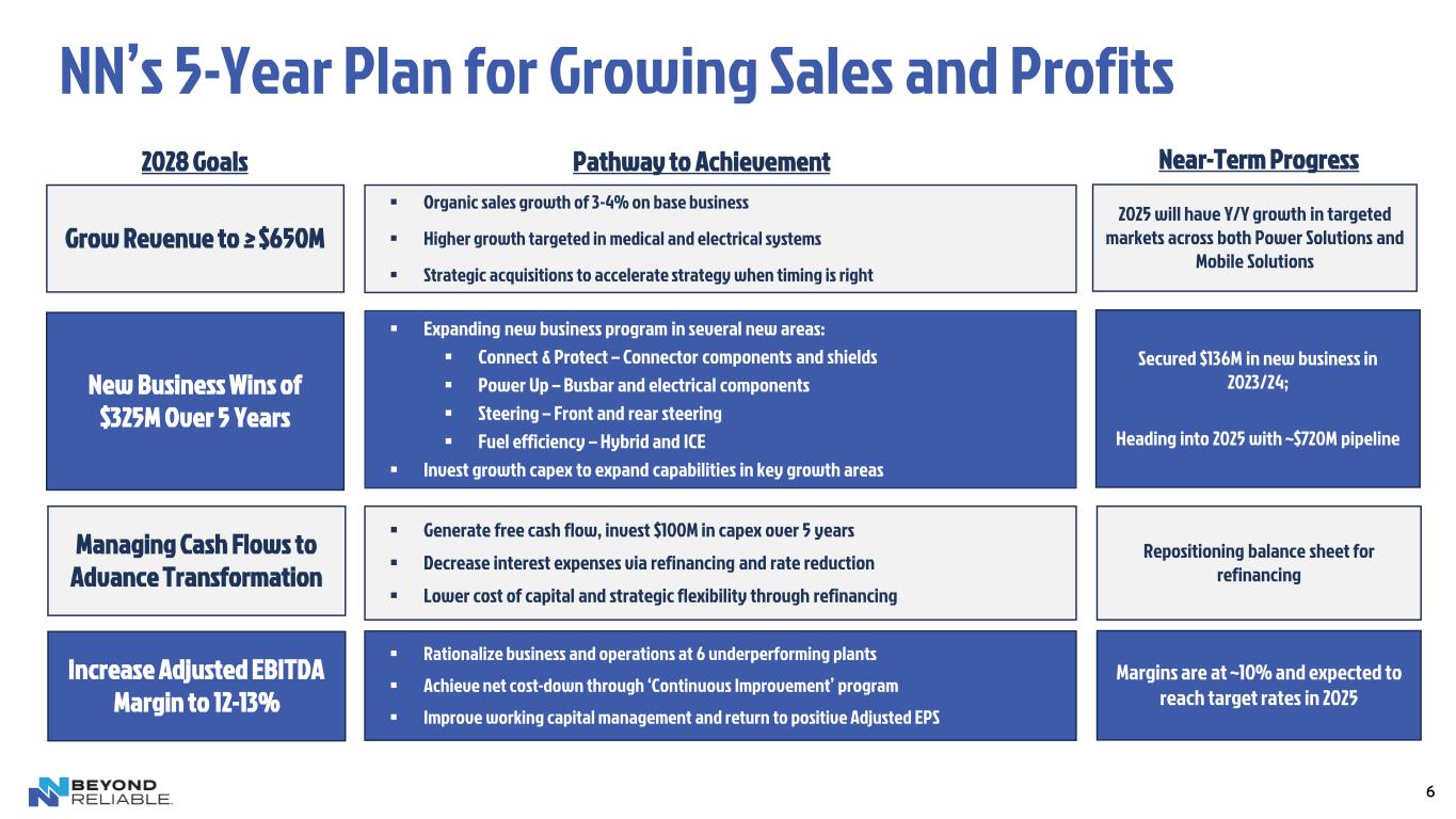 4 NN At A Glance *Trailing Twelve Months as of 9/30/24 ▪ Best-In-Class maker of high-precision, complex metal products ▪ Achieved $136 million in new business wins from 2023 to 2024 ▪ Targeting $65 million in annual wins as part of 5-year growth plan ▪ Supplemental goals include $50 million in Medical Components wins (5 years) and $50 million in Electrical Components wins (3 years) ▪ On track to achieve revenue diversification with margin accretive mix shift, and expansion in high-growth, high-value areas underway ▪ Organic growth through new wins is being achieved through innovation, technical leadership, and improved operational performance ▪ Strategic Partner to diversified and global customer base with long standing business relationships and long-running business streams ▪ Two Primary Product Segments: ▪ Power Solutions: precision stamped parts, plated parts, and subassemblies ▪ Mobile Solutions: primarily high-spec machined parts and assemblies ▪ Global Manufacturing Platform: 25 facilities in 6 countries, and China Joint Venture(1) machining plant with more than *$120 million in sales annually Revenue Breakdown* 61% Mobile Solutions 39% Power Solutions Global Employees ~3,000 + Additional ~700 in China JV Adjusted EBITDA* $46 million Revenue* $470 Million Adjusted EBITDA %* 10% Customers >1,100 (1) 49% ownership in China JV