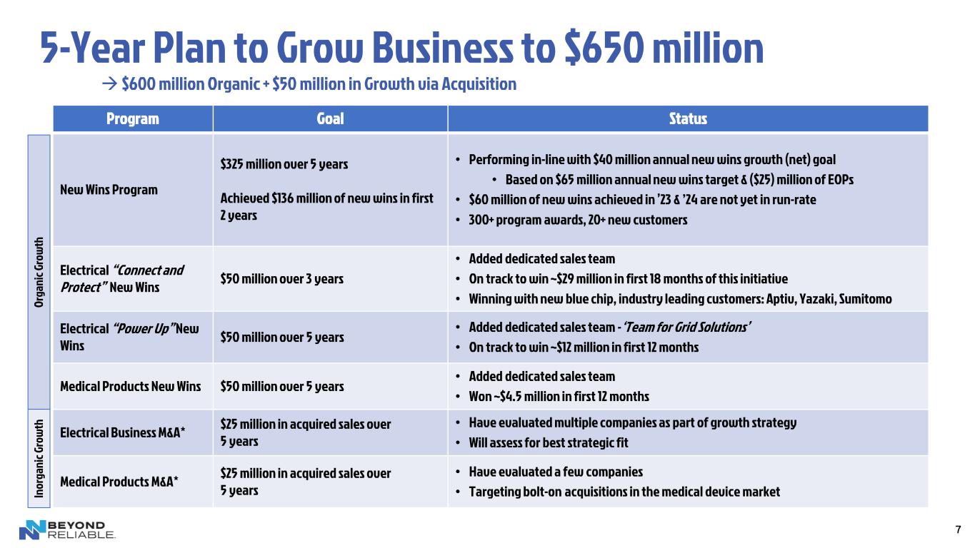 7 5-Year Plan to Grow Business to $650 million Program Goal Status New Wins Program $325 million over 5 years Achieved $136 million of new wins in first 2 years • Performing in-line with $40 million annual new wins growth (net) goal • Based on $65 million annual new wins target & ($25) million of EOPs • $60 million of new wins achieved in ’23 & ’24 are not yet in run-rate • 300+ program awards, 20+ new customers Electrical “Connect and Protect” New Wins $50 million over 3 years • Added dedicated sales team • On track to win ~$29 million in first 18 months of this initiative • Winning with new blue chip, industry leading customers: Aptiv, Yazaki, Sumitomo Electrical “Power Up” New Wins $50 million over 5 years • Added dedicated sales team -‘Team for Grid Solutions’ • On track to win ~$12 million in first 12 months Medical Products New Wins $50 million over 5 years • Added dedicated sales team • Won ~$4.5 million in first 12 months Electrical Business M&A* $25 million in acquired sales over 5 years • Have evaluated multiple companies as part of growth strategy • Will assess for best strategic fit Medical Products M&A* $25 million in acquired sales over 5 years • Have evaluated a few companies • Targeting bolt-on acquisitions in the medical device market → $600 million Organic + $50 million in Growth via Acquisition Or ga ni c G ro wt h In or ga ni c G ro wt h