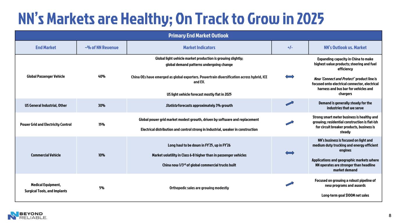 8 NN’s Markets are Healthy; On Track to Grow in 2025 Primary End Market Outlook End Market ~% of NN Revenue Market Indicators +/- NN’s Outlook vs. Market Global Passenger Vehicle 40% Global light vehicle market production is growing slightly; global demand patterns undergoing change China OEs have emerged as global exporters. Powertrain diversification across hybrid, ICE and EV. US light vehicle forecast mostly flat in 2025 Expanding capacity in China to make highest value products; steering and fuel efficiency New ‘Connect and Protect’ product line is focused onto electrical connector, electrical harness and bus bar for vehicles and chargers US General Industrial, Other 30% Statista forecasts approximately 3% growth Demand is generally steady for the industries that we serve Power Grid and Electricity Control 15% Global power grid market modest growth, driven by software and replacement Electrical distribution and control strong in Industrial, weaker in construction Strong smart meter business is healthy and growing; residential construction is flat-ish for circuit breaker products, business is steady Commercial Vehicle 10% Long haul to be down in FY’25, up in FY’26 Market volatility in Class 6-8 higher than in passenger vehicles China now 1/3rd of global commercial trucks built NN’s business is focused on light and medium duty trucking and energy efficient engines Applications and geographic markets where NN operates are stronger than headline market demand Medical Equipment, Surgical Tools, and Implants 5% Orthopedic sales are growing modestly Focused on growing a robust pipeline of new programs and awards Long-term goal $100M net sales