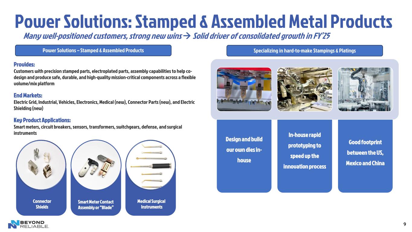 9 Power Solutions: Stamped & Assembled Metal Products Provides: Customers with precision stamped parts, electroplated parts, assembly capabilities to help co- design and produce safe, durable, and high-quality mission-critical components across a flexible volume/mix platform End Markets: Electric Grid, Industrial, Vehicles, Electronics, Medical (new), Connector Parts (new), and Electric Shielding (new) Key Product Applications: Smart meters, circuit breakers, sensors, transformers, switchgears, defense, and surgical instruments Connector Shields Smart Meter Contact Assembly or “Blade” Medical Surgical Instruments Power Solutions – Stamped & Assembled Products Specializing in hard-to-make Stampings & Platings Design and build our own dies in- house In-house rapid prototyping to speed up the innovation process Good footprint between the US, Mexico and China Many well-positioned customers, strong new wins → Solid driver of consolidated growth in FY’25