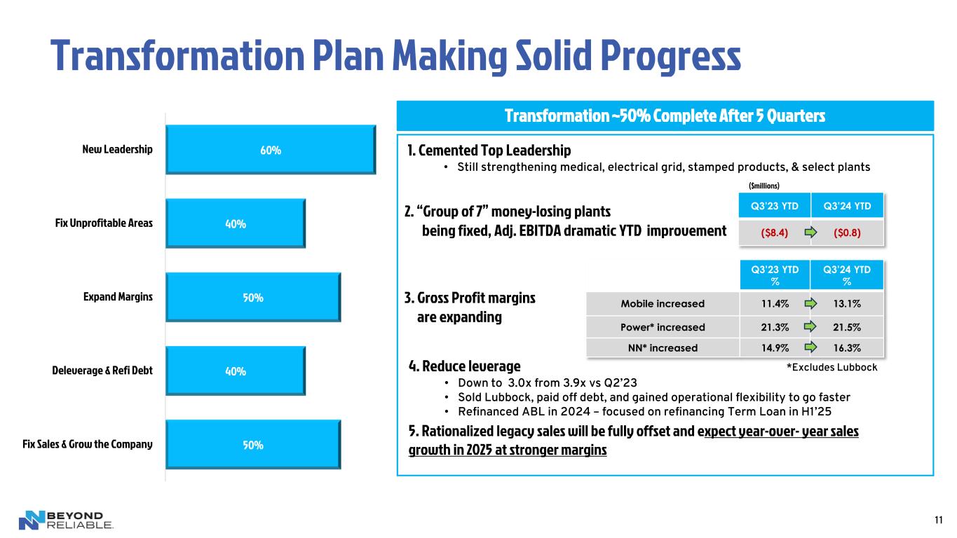 2. “Group of 7” money-losing plants being fixed, Adj. EBITDA dramatic YTD improvement 11 50% 40% 50% 40% 60% Fix Sales & Grow the Company Deleverage & Refi Debt Expand Margins Fix Unprofitable Areas New Leadership Q3’23 YTD Q3’24 YTD ($8.4) ($0.8) Q3’23 YTD % Q3’24 YTD % Mobile increased 11.4% 13.1% Power* increased 21.3% 21.5% NN* increased 14.9% 16.3% Transformation Plan Making Solid Progress 1. Cemented Top Leadership • Still strengthening medical, electrical grid, stamped products, & select plants 3. Gross Profit margins are expanding 4. Reduce leverage • Down to 3.0x from 3.9x vs Q2’23 • Sold Lubbock, paid off debt, and gained operational flexibility to go faster • Refinanced ABL in 2024 – focused on refinancing Term Loan in H1’25 5. Rationalized legacy sales will be fully offset and expect year-over- year sales growth in 2025 at stronger margins Transformation ~50% Complete After 5 Quarters ($millions) *Excludes Lubbock