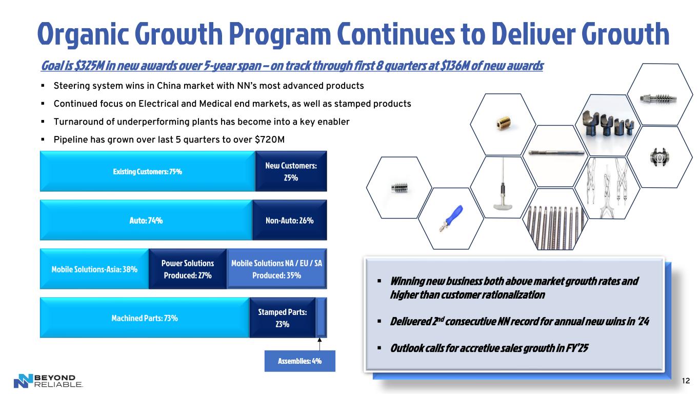 Organic Growth Program Continues to Deliver Growth 12 Goal is $325M in new awards over 5-year span – on track through first 8 quarters at $136M of new awards ▪ Steering system wins in China market with NN’s most advanced products ▪ Continued focus on Electrical and Medical end markets, as well as stamped products ▪ Turnaround of underperforming plants has become into a key enabler ▪ Pipeline has grown over last 5 quarters to over $720M ▪ Winning new business both above market growth rates and higher than customer rationalization ▪ Delivered 2nd consecutive NN record for annual new wins in ‘24 ▪ Outlook calls for accretive sales growth in FY’25 Machined Parts: 73% Mobile Solutions-Asia: 38% Auto: 74% Existing Customers: 75% Stamped Parts: 23% Power Solutions Produced: 27% Non-Auto: 26% New Customers: 25% Mobile Solutions NA / EU / SA Produced: 35% Assemblies: 4%