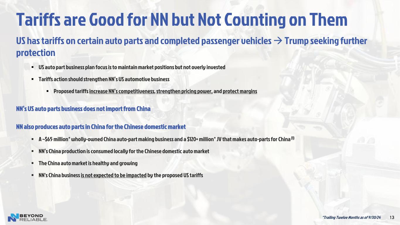 13 Tariffs are Good for NN but Not Counting on Them US has tariffs on certain auto parts and completed passenger vehicles → Trump seeking further protection ▪ US auto part business plan focus is to maintain market positions but not overly invested ▪ Tariffs action should strengthen NN’s US automotive business ▪ Proposed tariffs increase NN’s competitiveness, strengthen pricing power, and protect margins NN’s US auto parts business does not import from China NN also produces auto parts in China for the Chinese domestic market ▪ A ~$65 million* wholly-owned China auto-part making business and a $120+ million* JV that makes auto-parts for China (1) ▪ NN’s China production is consumed locally for the Chinese domestic auto market ▪ The China auto market is healthy and growing ▪ NN's China business is not expected to be impacted by the proposed US tariffs *Trailing Twelve Months as of 9/30/24