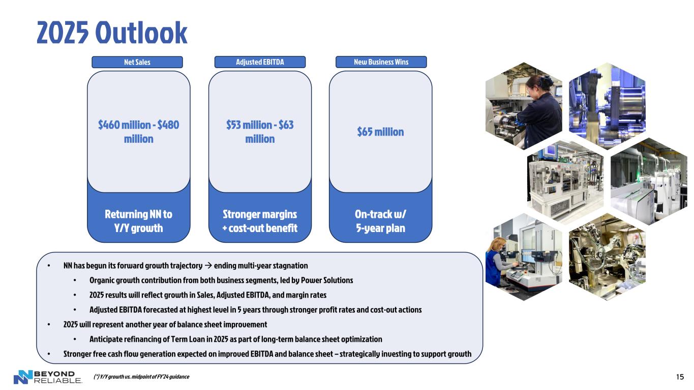 15 2025 Outlook Returning NN to Y/Y growth $460 million - $480 million Net Sales Stronger margins + cost-out benefit $53 million - $63 million Adjusted EBITDA On-track w/ 5-year plan $65 million New Business Wins • NN has begun its forward growth trajectory → ending multi-year stagnation • Organic growth contribution from both business segments, led by Power Solutions • 2025 results will reflect growth in Sales, Adjusted EBITDA, and margin rates • Adjusted EBITDA forecasted at highest level in 5 years through stronger profit rates and cost-out actions • 2025 will represent another year of balance sheet improvement • Anticipate refinancing of Term Loan in 2025 as part of long-term balance sheet optimization • Stronger free cash flow generation expected on improved EBITDA and balance sheet – strategically investing to support growth (*) Y/Y growth vs. midpoint of FY’24 guidance
