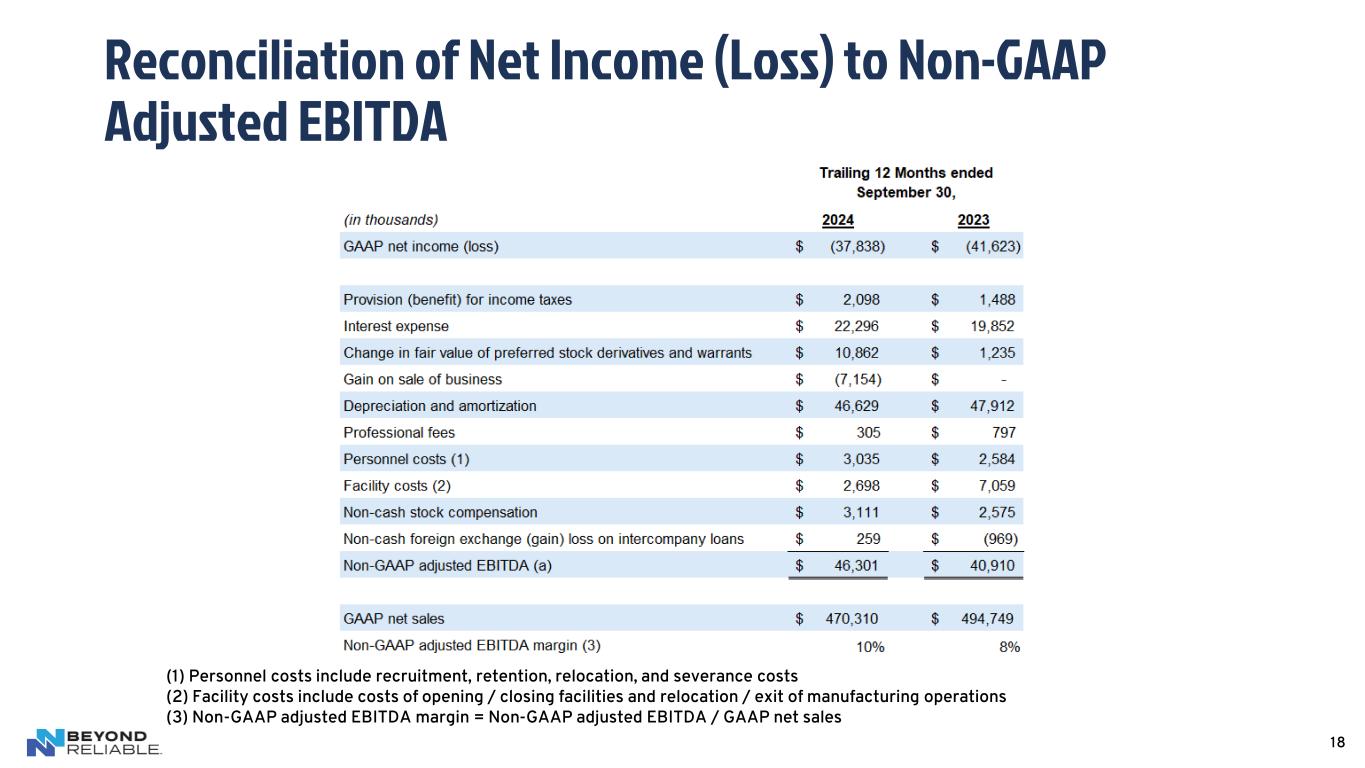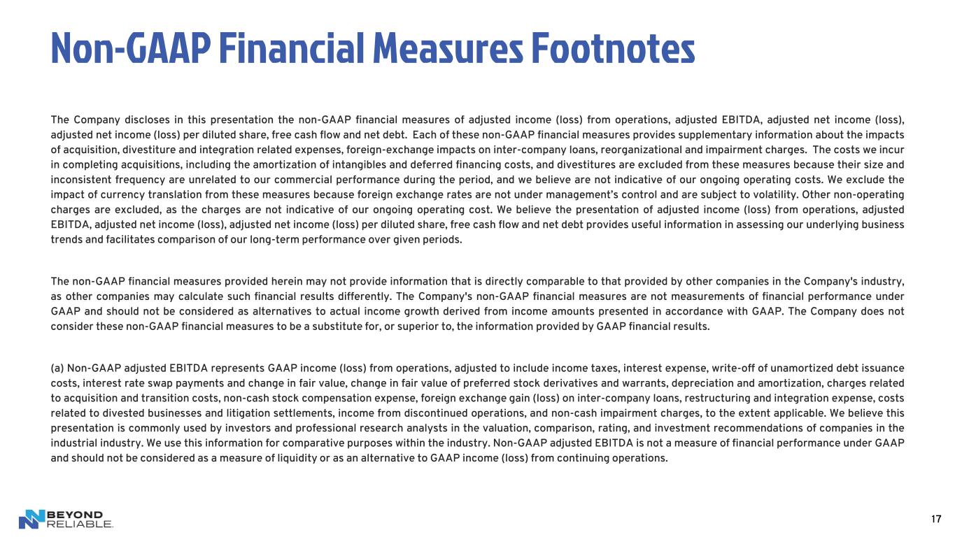 17 The Company discloses in this presentation the non-GAAP financial measures of adjusted income (loss) from operations, adjusted EBITDA, adjusted net income (loss), adjusted net income (loss) per diluted share, free cash flow and net debt. Each of these non-GAAP financial measures provides supplementary information about the impacts of acquisition, divestiture and integration related expenses, foreign-exchange impacts on inter-company loans, reorganizational and impairment charges. The costs we incur in completing acquisitions, including the amortization of intangibles and deferred financing costs, and divestitures are excluded from these measures because their size and inconsistent frequency are unrelated to our commercial performance during the period, and we believe are not indicative of our ongoing operating costs. We exclude the impact of currency translation from these measures because foreign exchange rates are not under management’s control and are subject to volatility. Other non-operating charges are excluded, as the charges are not indicative of our ongoing operating cost. We believe the presentation of adjusted income (loss) from operations, adjusted EBITDA, adjusted net income (loss), adjusted net income (loss) per diluted share, free cash flow and net debt provides useful information in assessing our underlying business trends and facilitates comparison of our long-term performance over given periods. The non-GAAP financial measures provided herein may not provide information that is directly comparable to that provided by other companies in the Company's industry, as other companies may calculate such financial results differently. The Company's non-GAAP financial measures are not measurements of financial performance under GAAP and should not be considered as alternatives to actual income growth derived from income amounts presented in accordance with GAAP. The Company does not consider these non-GAAP financial measures to be a substitute for, or superior to, the information provided by GAAP financial results. (a) Non-GAAP adjusted EBITDA represents GAAP income (loss) from operations, adjusted to include income taxes, interest expense, write-off of unamortized debt issuance costs, interest rate swap payments and change in fair value, change in fair value of preferred stock derivatives and warrants, depreciation and amortization, charges related to acquisition and transition costs, non-cash stock compensation expense, foreign exchange gain (loss) on inter-company loans, restructuring and integration expense, costs related to divested businesses and litigation settlements, income from discontinued operations, and non-cash impairment charges, to the extent applicable. We believe this presentation is commonly used by investors and professional research analysts in the valuation, comparison, rating, and investment recommendations of companies in the industrial industry. We use this information for comparative purposes within the industry. Non-GAAP adjusted EBITDA is not a measure of financial performance under GAAP and should not be considered as a measure of liquidity or as an alternative to GAAP income (loss) from continuing operations. Non-GAAP Financial Measures Footnotes