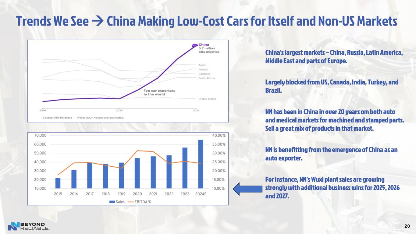 20 Trends We See → China Making Low-Cost Cars for Itself and Non-US Markets China's largest markets – China, Russia, Latin America, Middle East and parts of Europe. Largely blocked from US, Canada, India, Turkey, and Brazil. NN has been in China in over 20 years om both auto and medical markets for machined and stamped parts. Sell a great mix of products in that market. NN is benefitting from the emergence of China as an auto exporter. For instance, NN's Wuxi plant sales are growing strongly with additional business wins for 2025, 2026 and 2027.