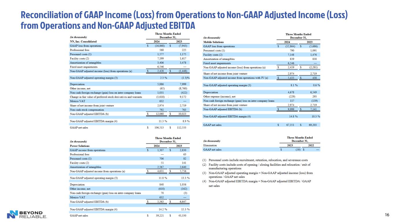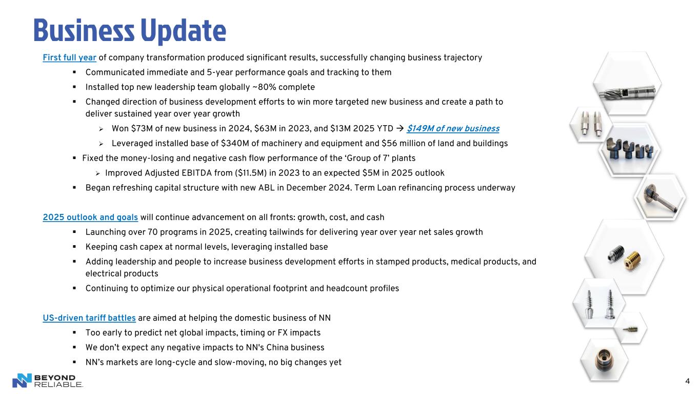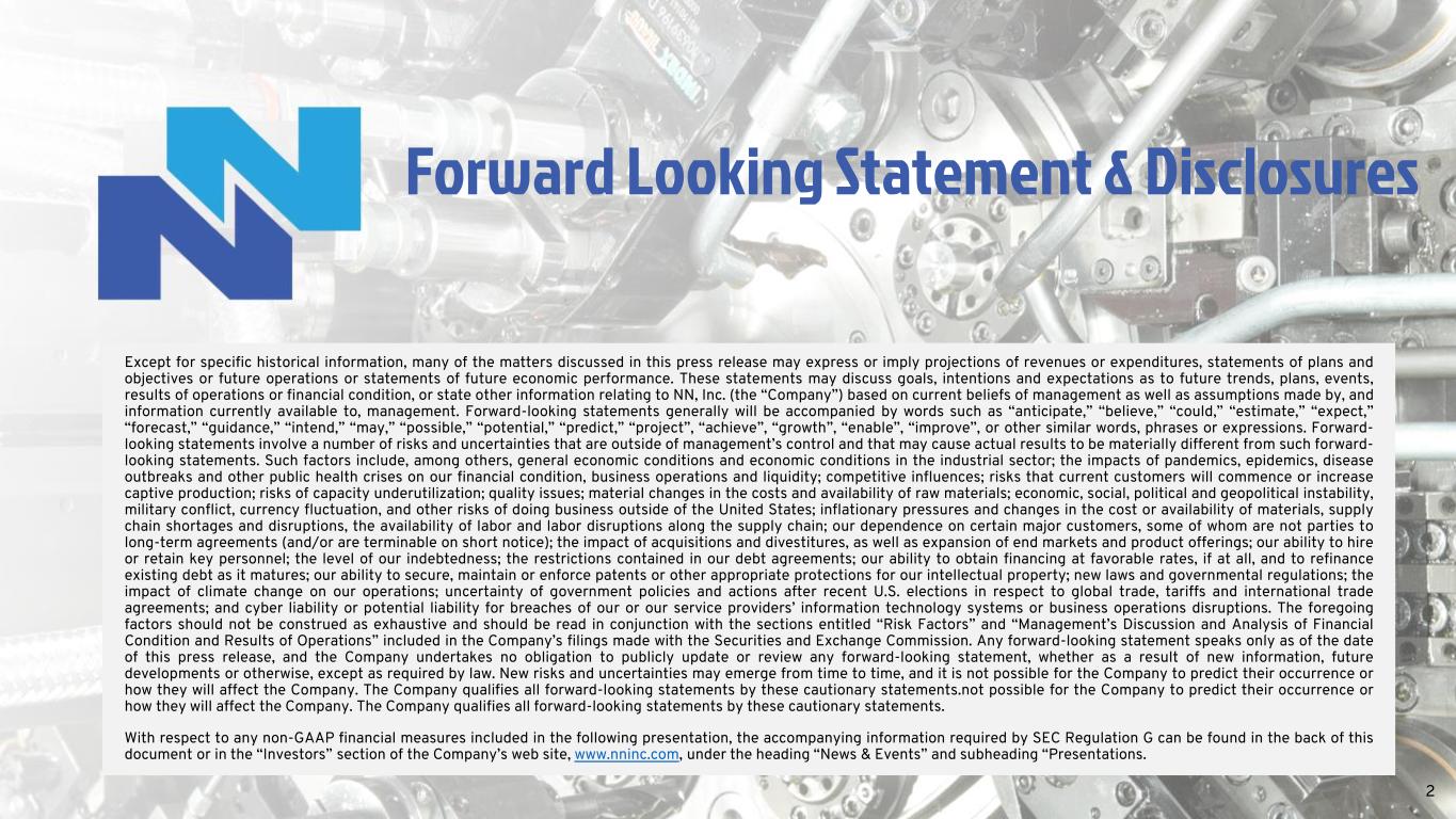Except for specific historical information, many of the matters discussed in this press release may express or imply projections of revenues or expenditures, statements of plans and objectives or future operations or statements of future economic performance. These statements may discuss goals, intentions and expectations as to future trends, plans, events, results of operations or financial condition, or state other information relating to NN, Inc. (the “Company”) based on current beliefs of management as well as assumptions made by, and information currently available to, management. Forward-looking statements generally will be accompanied by words such as “anticipate,” “believe,” “could,” “estimate,” “expect,” “forecast,” “guidance,” “intend,” “may,” “possible,” “potential,” “predict,” “project”, “achieve”, “growth”, “enable”, “improve”, or other similar words, phrases or expressions. Forward- looking statements involve a number of risks and uncertainties that are outside of management’s control and that may cause actual results to be materially different from such forward- looking statements. Such factors include, among others, general economic conditions and economic conditions in the industrial sector; the impacts of pandemics, epidemics, disease outbreaks and other public health crises on our financial condition, business operations and liquidity; competitive influences; risks that current customers will commence or increase captive production; risks of capacity underutilization; quality issues; material changes in the costs and availability of raw materials; economic, social, political and geopolitical instability, military conflict, currency fluctuation, and other risks of doing business outside of the United States; inflationary pressures and changes in the cost or availability of materials, supply chain shortages and disruptions, the availability of labor and labor disruptions along the supply chain; our dependence on certain major customers, some of whom are not parties to long-term agreements (and/or are terminable on short notice); the impact of acquisitions and divestitures, as well as expansion of end markets and product offerings; our ability to hire or retain key personnel; the level of our indebtedness; the restrictions contained in our debt agreements; our ability to obtain financing at favorable rates, if at all, and to refinance existing debt as it matures; our ability to secure, maintain or enforce patents or other appropriate protections for our intellectual property; new laws and governmental regulations; the impact of climate change on our operations; uncertainty of government policies and actions after recent U.S. elections in respect to global trade, tariffs and international trade agreements; and cyber liability or potential liability for breaches of our or our service providers’ information technology systems or business operations disruptions. The foregoing factors should not be construed as exhaustive and should be read in conjunction with the sections entitled “Risk Factors” and “Management’s Discussion and Analysis of Financial Condition and Results of Operations” included in the Company’s filings made with the Securities and Exchange Commission. Any forward-looking statement speaks only as of the date of this press release, and the Company undertakes no obligation to publicly update or review any forward-looking statement, whether as a result of new information, future developments or otherwise, except as required by law. New risks and uncertainties may emerge from time to time, and it is not possible for the Company to predict their occurrence or how they will affect the Company. The Company qualifies all forward-looking statements by these cautionary statements.not possible for the Company to predict their occurrence or how they will affect the Company. The Company qualifies all forward-looking statements by these cautionary statements. With respect to any non-GAAP financial measures included in the following presentation, the accompanying information required by SEC Regulation G can be found in the back of this document or in the “Investors” section of the Company’s web site, www.nninc.com, under the heading “News & Events” and subheading “Presentations. Forward Looking Statement & Disclosures 2