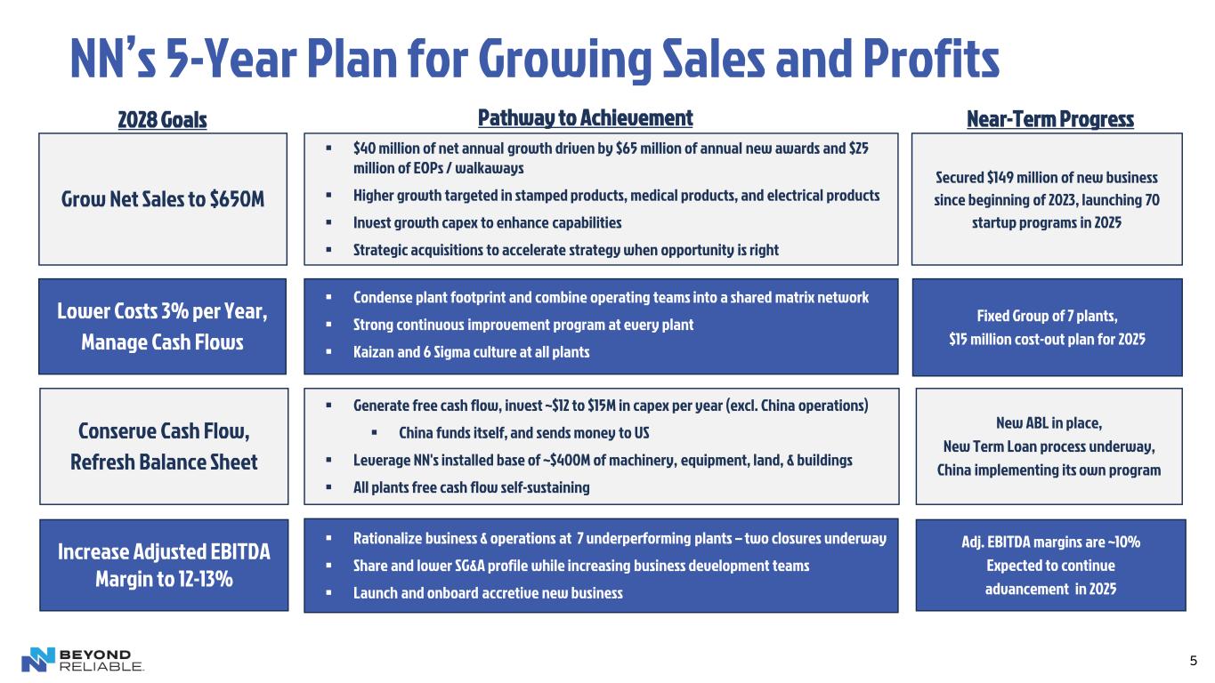 4 First full year of company transformation produced significant results, successfully changing business trajectory ▪ Communicated immediate and 5-year performance goals and tracking to them ▪ Installed top new leadership team globally ~80% complete ▪ Changed direction of business development efforts to win more targeted new business and create a path to deliver sustained year over year growth ➢ Won $73M of new business in 2024, $63M in 2023, and $13M 2025 YTD → $149M of new business ➢ Leveraged installed base of $340M of machinery and equipment and $56 million of land and buildings ▪ Fixed the money-losing and negative cash flow performance of the ‘Group of 7’ plants ➢ Improved Adjusted EBITDA from ($11.5M) in 2023 to an expected $5M in 2025 outlook ▪ Began refreshing capital structure with new ABL in December 2024. Term Loan refinancing process underway 2025 outlook and goals will continue advancement on all fronts: growth, cost, and cash ▪ Launching over 70 programs in 2025, creating tailwinds for delivering year over year net sales growth ▪ Keeping cash capex at normal levels, leveraging installed base ▪ Adding leadership and people to increase business development efforts in stamped products, medical products, and electrical products ▪ Continuing to optimize our physical operational footprint and headcount profiles US-driven tariff battles are aimed at helping the domestic business of NN ▪ Too early to predict net global impacts, timing or FX impacts ▪ We don’t expect any negative impacts to NN's China business ▪ NN’s markets are long-cycle and slow-moving, no big changes yet Business Update
