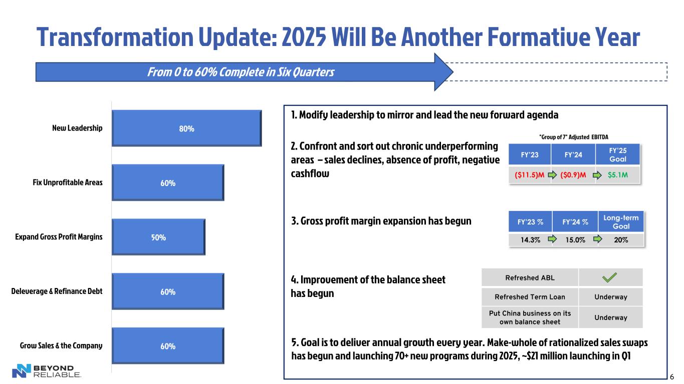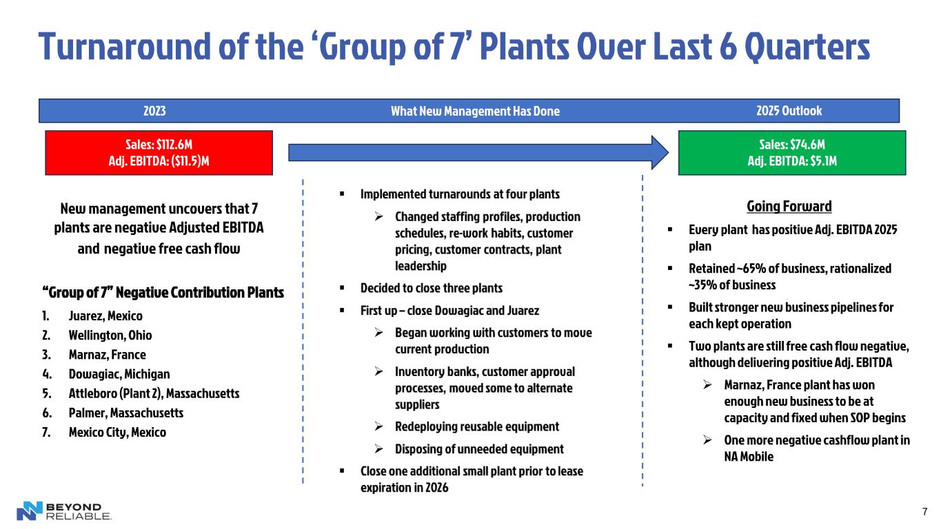2. Confront and sort out chronic underperforming areas – sales declines, absence of profit, negative cashflow 6 60% 60% 50% 60% 80% Grow Sales & the Company Deleverage & Refinance Debt Expand Gross Profit Margins Fix Unprofitable Areas New Leadership FY’23 % FY’24 % Long-term Goal 14.3% 15.0% 20% Transformation Update: 2025 Will Be Another Formative Year 1. Modify leadership to mirror and lead the new forward agenda 3. Gross profit margin expansion has begun 4. Improvement of the balance sheet has begun 5. Goal is to deliver annual growth every year. Make-whole of rationalized sales swaps has begun and launching 70+ new programs during 2025, ~$21 million launching in Q1 FY’23 FY’24 FY’25 Goal ($11.5)M ($0.9)M $5.1M From 0 to 60% Complete in Six Quarters Refreshed ABL Refreshed Term Loan Underway Put China business on its own balance sheet Underway "Group of 7" Adjusted EBITDA