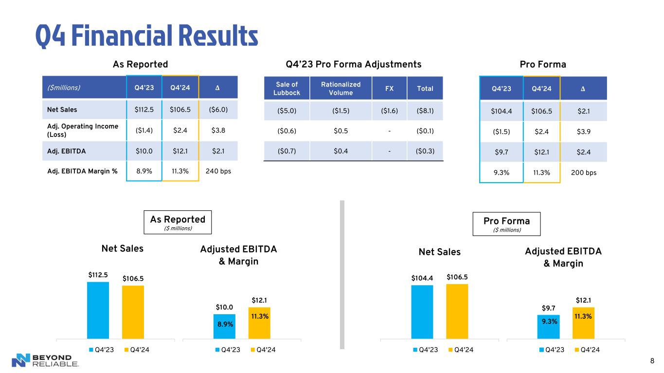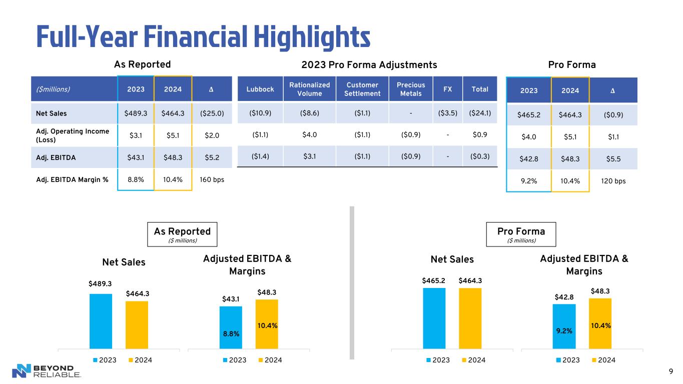 11.6 % ($millions) Q4’23 Q4’24 Δ Net Sales $112.5 $106.5 ($6.0) Adj. Operating Income (Loss) ($1.4) $2.4 $3.8 Adj. EBITDA $10.0 $12.1 $2.1 Adj. EBITDA Margin % 8.9% 11.3% 240 bps Q4’23 Q4’24 Δ $104.4 $106.5 $2.1 ($1.5) $2.4 $3.9 $9.7 $12.1 $2.4 9.3% 11.3% 200 bps Sale of Lubbock Rationalized Volume FX Total ($5.0) ($1.5) ($1.6) ($8.1) ($0.6) $0.5 - ($0.1) ($0.7) $0.4 - ($0.3) $9.7 $12.1 Adjusted EBITDA & Margin Q4'23 Q4'24 Pro FormaAs Reported Q4’23 Pro Forma Adjustments Q4 Financial Results 8 $104.4 $106.5 Net Sales Q4'23 Q4'24 $10.0 $12.1 Adjusted EBITDA & Margin Q4'23 Q4'24 $112.5 $106.5 Net Sales Q4'23 Q4'24 8.9% 11.3% 9.3% 11.3% Pro Forma ($ millions) As Reported ($ millions)