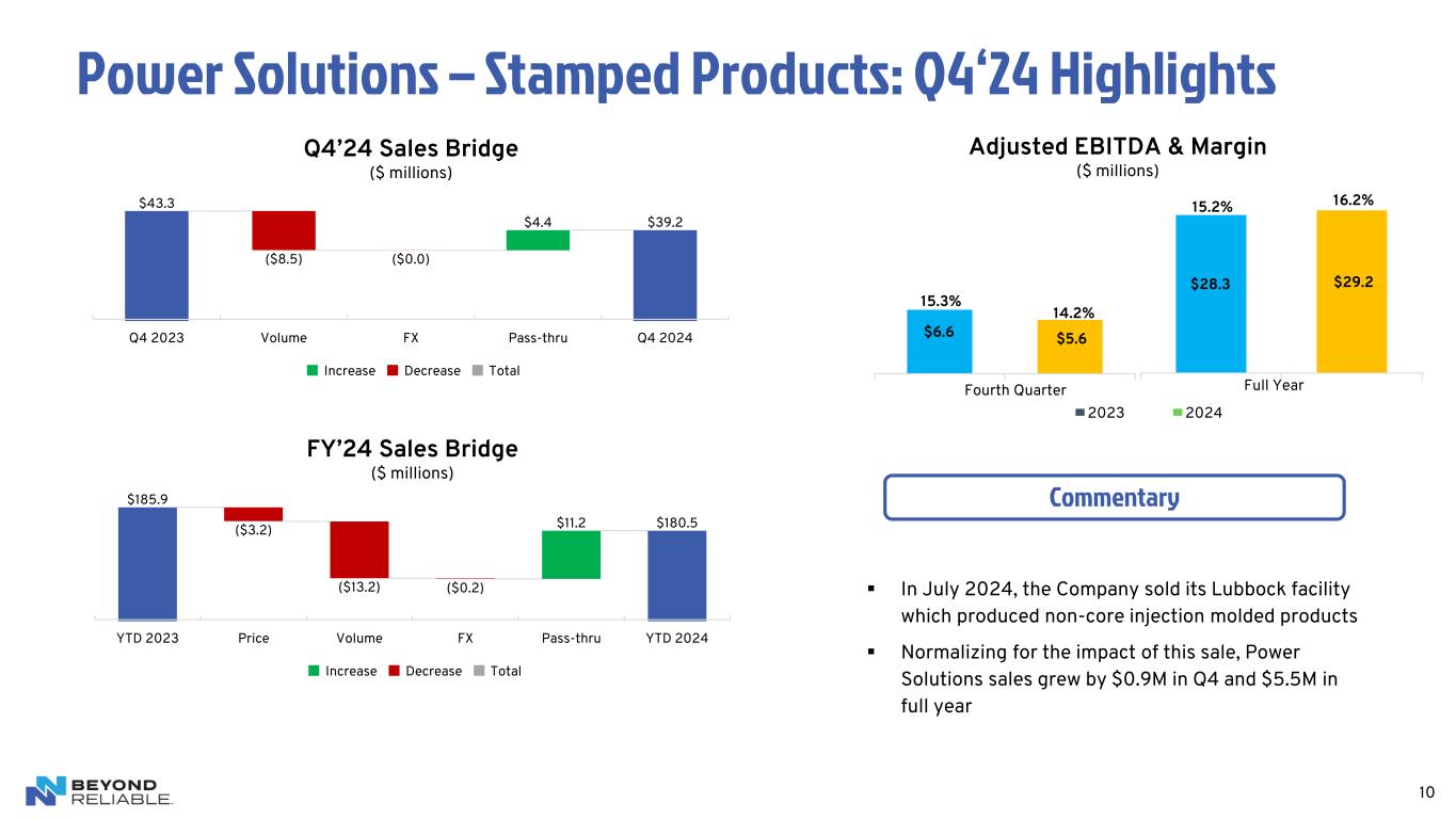 $42.8 $48.3 Adjusted EBITDA & Margins 2023 2024 ($millions) 2023 2024 Δ Net Sales $489.3 $464.3 ($25.0) Adj. Operating Income (Loss) $3.1 $5.1 $2.0 Adj. EBITDA $43.1 $48.3 $5.2 Adj. EBITDA Margin % 8.8% 10.4% 160 bps 2023 2024 Δ $465.2 $464.3 ($0.9) $4.0 $5.1 $1.1 $42.8 $48.3 $5.5 9.2% 10.4% 120 bps Lubbock Rationalized Volume Customer Settlement Precious Metals FX Total ($10.9) ($8.6) ($1.1) - ($3.5) ($24.1) ($1.1) $4.0 ($1.1) ($0.9) - $0.9 ($1.4) $3.1 ($1.1) ($0.9) - ($0.3) Pro FormaAs Reported 2023 Pro Forma Adjustments Full-Year Financial Highlights 9 $465.2 $464.3 Net Sales 2023 2024 Pro Forma ($ millions) $43.1 $48.3 Adjusted EBITDA & Margins 2023 2024 $489.3 $464.3 Net Sales 2023 2024 As Reported ($ millions) 8.8% 10.4% 9.2% 10.4%