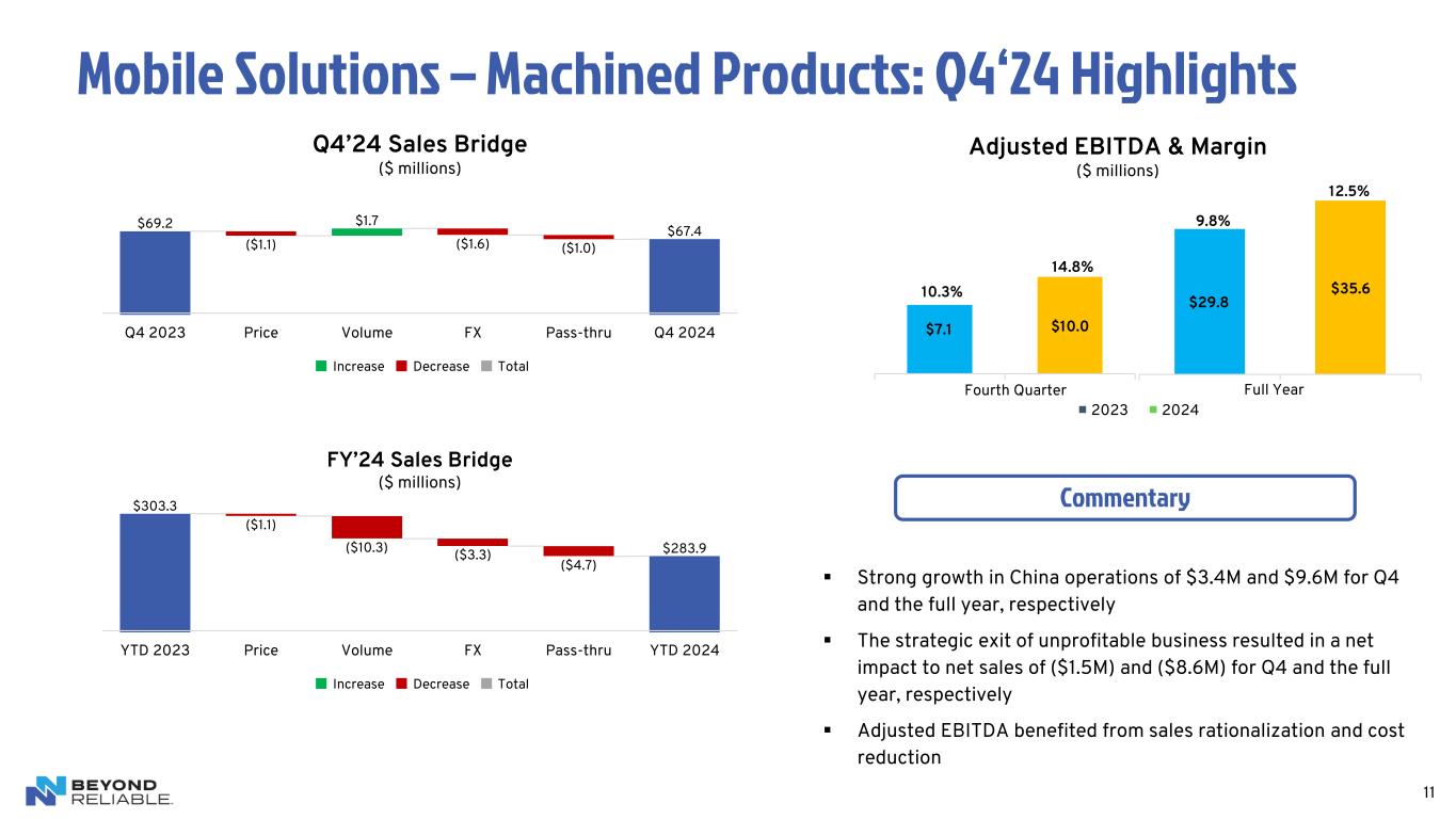 $6.6 $5.6 2023 2024 Fourth Quarter $28.3 $29.2 2023 2024 Full Year Adjusted EBITDA & Margin ($ millions) Power Solutions – Stamped Products: Q4‘24 Highlights 10 2023 2024 ▪ In July 2024, the Company sold its Lubbock facility which produced non-core injection molded products ▪ Normalizing for the impact of this sale, Power Solutions sales grew by $0.9M in Q4 and $5.5M in full year $43.3 ($8.5) ($0.0) $4.4 $39.2 Q4 2023 Volume FX Pass-thru Q4 2024 Q4’24 Sales Bridge ($ millions) Increase Decrease Total $185.9 ($3.2) ($13.2) ($0.2) $11.2 $180.5 YTD 2023 Price Volume FX Pass-thru YTD 2024 FY’24 Sales Bridge ($ millions) Increase Decrease Total Commentary 15.3% 14.2% 15.2% 16.2%