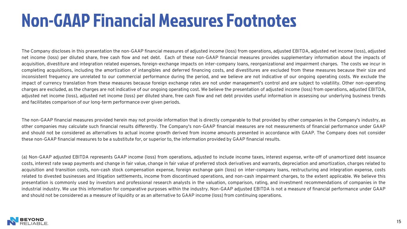 15 The Company discloses in this presentation the non-GAAP financial measures of adjusted income (loss) from operations, adjusted EBITDA, adjusted net income (loss), adjusted net income (loss) per diluted share, free cash flow and net debt. Each of these non-GAAP financial measures provides supplementary information about the impacts of acquisition, divestiture and integration related expenses, foreign-exchange impacts on inter-company loans, reorganizational and impairment charges. The costs we incur in completing acquisitions, including the amortization of intangibles and deferred financing costs, and divestitures are excluded from these measures because their size and inconsistent frequency are unrelated to our commercial performance during the period, and we believe are not indicative of our ongoing operating costs. We exclude the impact of currency translation from these measures because foreign exchange rates are not under management’s control and are subject to volatility. Other non-operating charges are excluded, as the charges are not indicative of our ongoing operating cost. We believe the presentation of adjusted income (loss) from operations, adjusted EBITDA, adjusted net income (loss), adjusted net income (loss) per diluted share, free cash flow and net debt provides useful information in assessing our underlying business trends and facilitates comparison of our long-term performance over given periods. The non-GAAP financial measures provided herein may not provide information that is directly comparable to that provided by other companies in the Company's industry, as other companies may calculate such financial results differently. The Company's non-GAAP financial measures are not measurements of financial performance under GAAP and should not be considered as alternatives to actual income growth derived from income amounts presented in accordance with GAAP. The Company does not consider these non-GAAP financial measures to be a substitute for, or superior to, the information provided by GAAP financial results. (a) Non-GAAP adjusted EBITDA represents GAAP income (loss) from operations, adjusted to include income taxes, interest expense, write-off of unamortized debt issuance costs, interest rate swap payments and change in fair value, change in fair value of preferred stock derivatives and warrants, depreciation and amortization, charges related to acquisition and transition costs, non-cash stock compensation expense, foreign exchange gain (loss) on inter-company loans, restructuring and integration expense, costs related to divested businesses and litigation settlements, income from discontinued operations, and non-cash impairment charges, to the extent applicable. We believe this presentation is commonly used by investors and professional research analysts in the valuation, comparison, rating, and investment recommendations of companies in the industrial industry. We use this information for comparative purposes within the industry. Non-GAAP adjusted EBITDA is not a measure of financial performance under GAAP and should not be considered as a measure of liquidity or as an alternative to GAAP income (loss) from continuing operations. Non-GAAP Financial Measures Footnotes