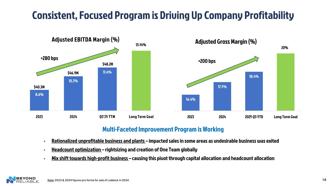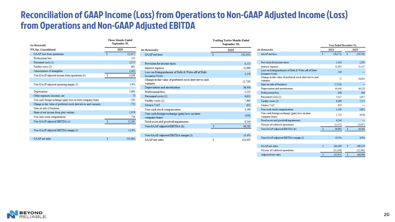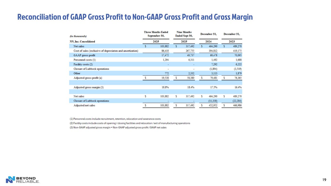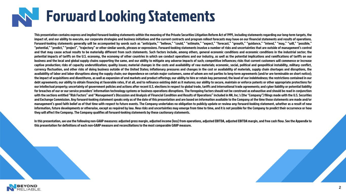 2 Forward Looking Statements This presentation contains express and implied forward-looking statements within the meaning of the Private Securities Litigation Reform Act of 1995, including statements regarding our long-term targets, the impact of, and our ability to execute, our corporate strategies and business initiatives and the current contracts and program rollout forecasts may have on our financial statements and results of operations. Forward-looking statements generally will be accompanied by words such as “anticipate,” “believe,” “could,” “estimate,” “expect,” “forecast,” “growth,” “guidance,” “intend,” “may,” “will,” “possible,” “potential,” “predict,” “project”, “trajectory” or other similar words, phrases or expressions. Forward-looking statements involve a number of risks and uncertainties that are outside of management’s control and that may cause actual results to be materially different from such statements. Such factors include, among others, general economic conditions and economic conditions in the industrial sector; the potential impacts of tariffs on the U.S. economy, the economy of other countries in which we conduct operations and our industry, as well as the potential implications and ramifications of tariffs on our business and the local and global supply chains supporting the same, and our ability to mitigate any adverse impacts of such; competitive influences; risks that current customers will commence or increase captive production; risks of capacity underutilization; quality issues; material changes in the costs and availability of raw materials; economic, social, political and geopolitical instability, military conflict, currency fluctuation, and other risks of doing business outside of the United States; inflationary pressures and changes in the cost or availability of materials, supply chain shortages and disruptions, the availability of labor and labor disruptions along the supply chain; our dependence on certain major customers, some of whom are not parties to long-term agreements (and/or are terminable on short notice); the impact of acquisitions and divestitures, as well as expansion of end markets and product offerings; our ability to hire or retain key personnel; the level of our indebtedness; the restrictions contained in our debt agreements; our ability to obtain financing at favorable rates, if at all, and to refinance existing debt as it matures; our ability to secure, maintain or enforce patents or other appropriate protections for our intellectual property; uncertainty of government policies and actions after recent U.S. elections in respect to global trade, tariffs and international trade agreements; and cyber liability or potential liability for breaches of our or our service providers’ information technology systems or business operations disruptions. The foregoing factors should not be construed as exhaustive and should be read in conjunction with the sections entitled “Risk Factors” and “Management’s Discussion and Analysis of Financial Condition and Results of Operations” included in NN, Inc.'s (the "Company") filings made with the U.S. Securities and Exchange Commission. Any forward-looking statement speaks only as of the date of this presentation and are based on information available to the Company at the time those statements are made and/or management’s good faith belief as of that time with respect to future events. The Company undertakes no obligation to publicly update or review any forward-looking statement, whether as a result of new information, future developments or otherwise, except as required by law. New risks and uncertainties may emerge from time to time, and it is not possible for the Company to predict their occurrence or how they will affect the Company. The Company qualifies all forward-looking statements by these cautionary statements. In this presentation, we use the following non-GAAP measures: adjusted gross margin, adjusted income (loss) from operations, adjusted EBITDA, adjusted EBITDA margin, and free cash flow. See the Appendix to this presentation for definitions of each non-GAAP measure and reconciliations to the most comparable GAAP measure.